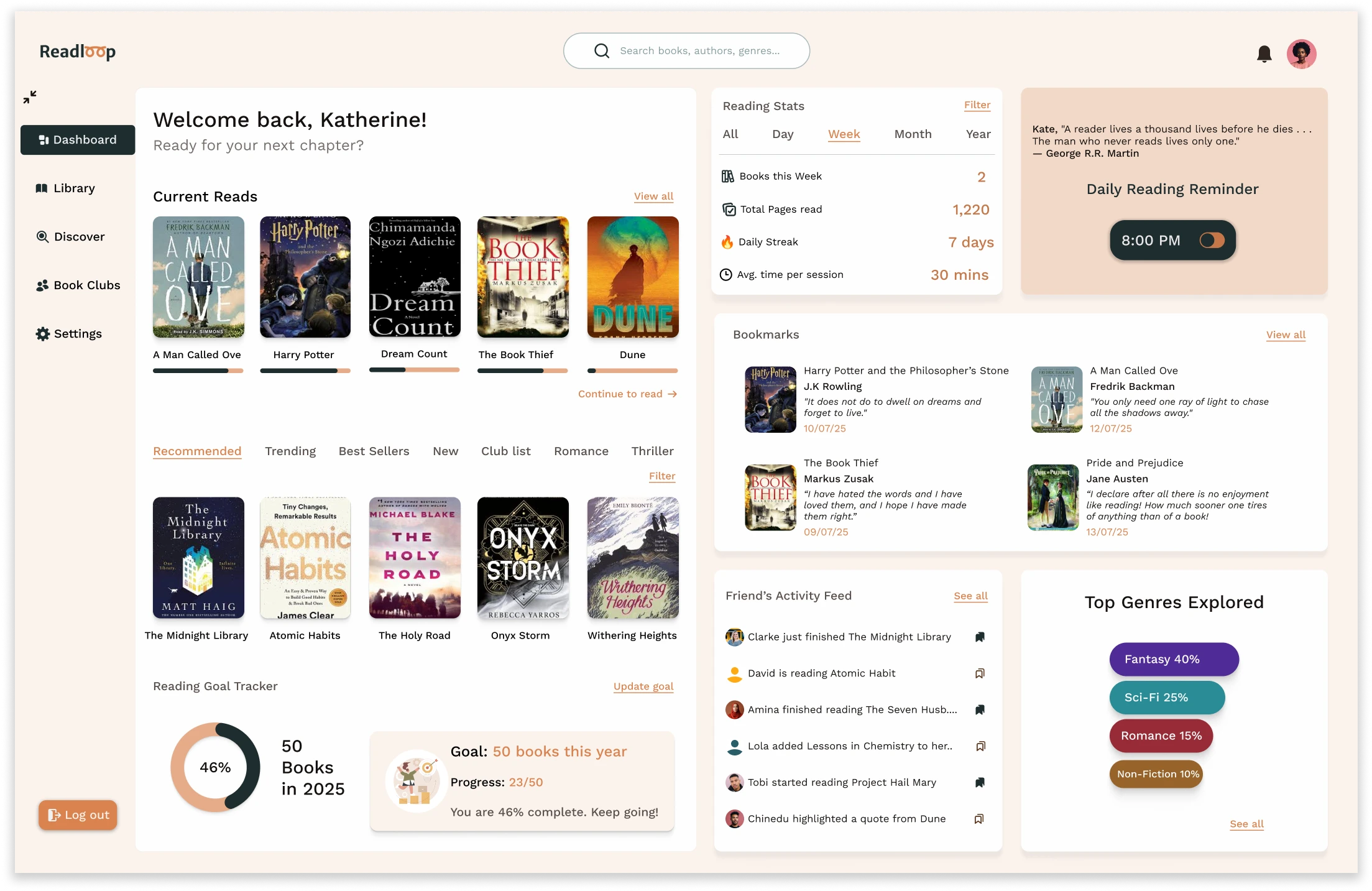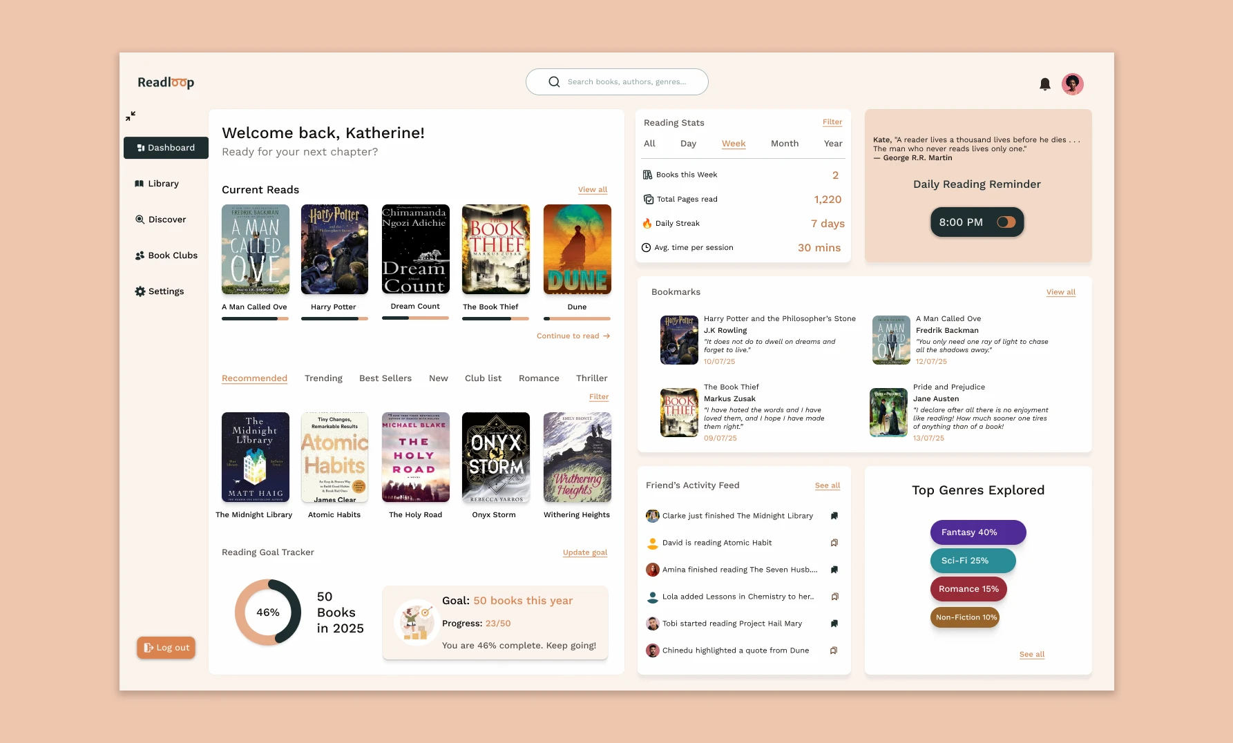 ReadLoop is a personalized reading tracker and book discovery platform. After designing the landing page, I created the core user dashboard experience — helping users stay on top of their reading journey.