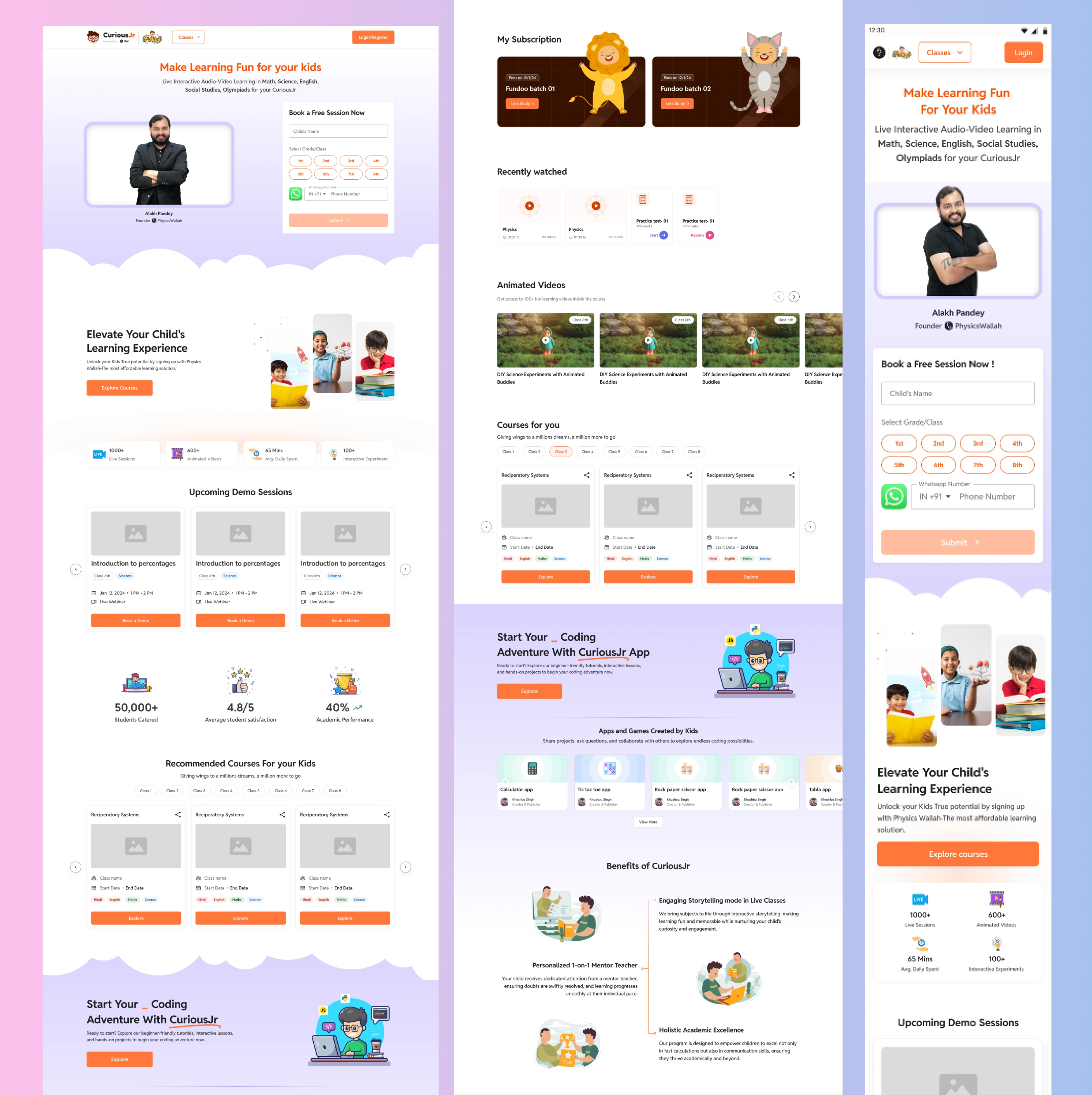This project was designed for Curious Jr, an engaging, child-friendly online learning platform under PW (Physics Wallah), catering to students from class 1 to 10. The goal was to create an interactive and fun UI/UX that supports live classes, coding sessions, educational videos, and personalized learning paths.