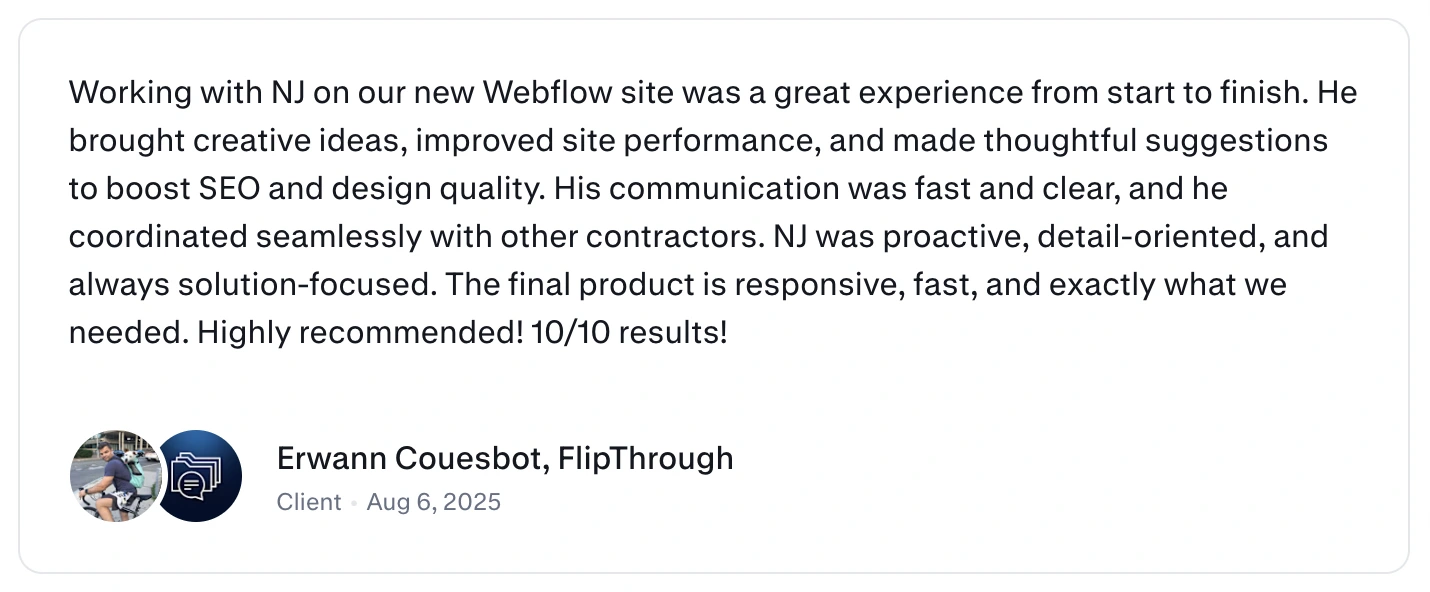 Maintainability. Because the animations live natively inside Webflow, they're fully editable without going back to a designer. If the team needs to update details in any animation down the line, they (or I) can jump into Webflow and make changes directly. No need to regenerate Lottie files or loop in a designer for simple updates. This gives the client long-term independence over their own site.