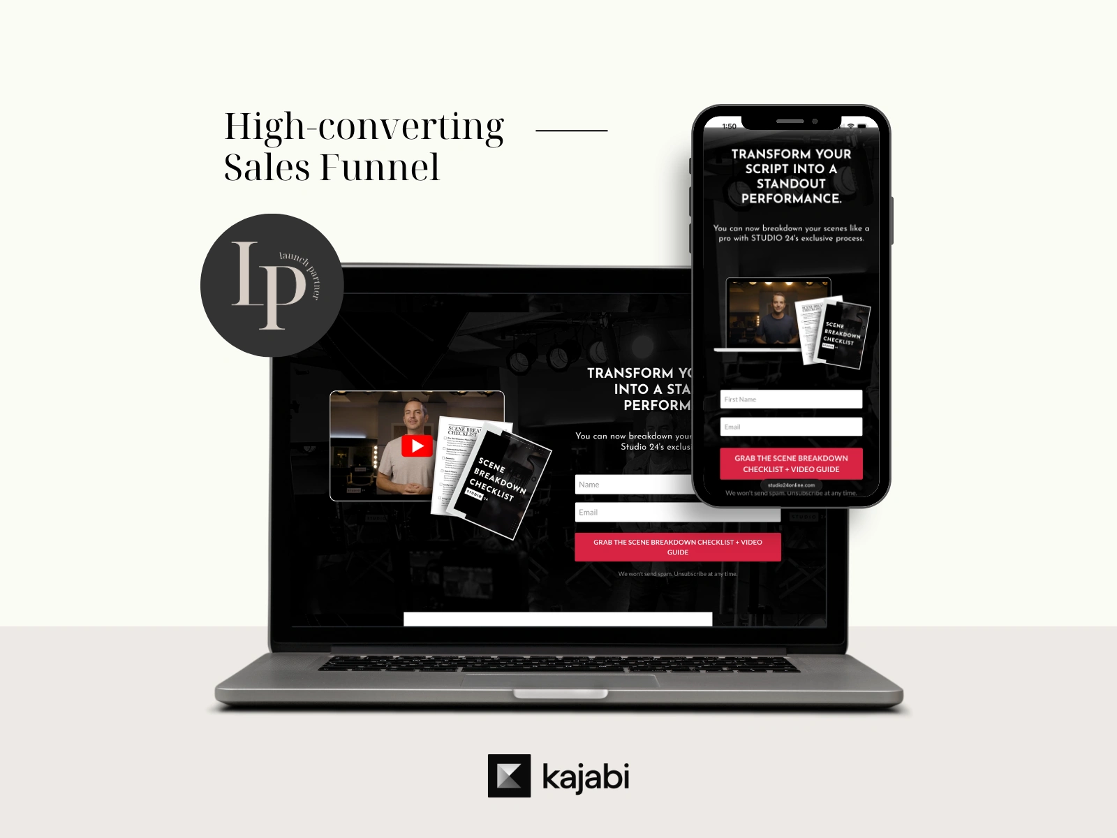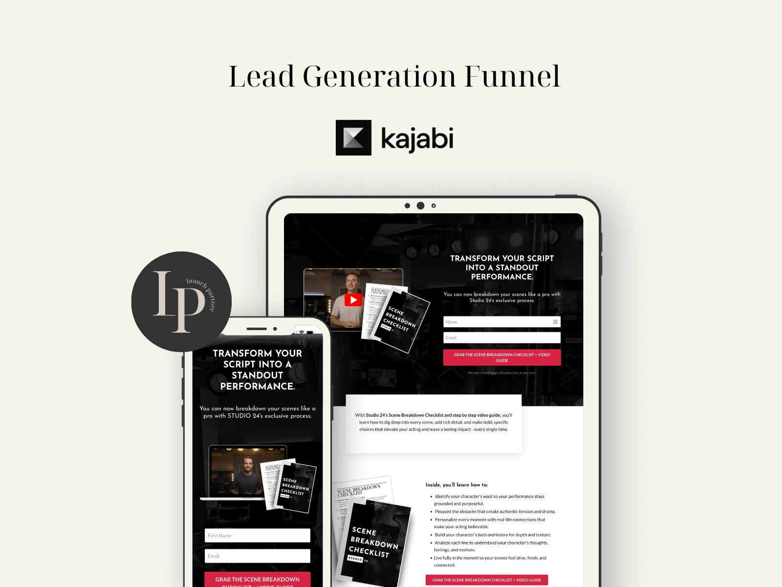 Cody needed a structured platform to deliver his acting program, grow his email list, and build a stronger connection with his audience. I built and designed his online course, created a lead generation funnel, and set up his Kajabi community to support engagement and retention. After launch, he began promoting his lead magnet through YouTube, steadily growing his email list and enrolling new members into his online course.