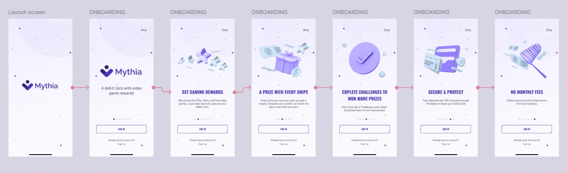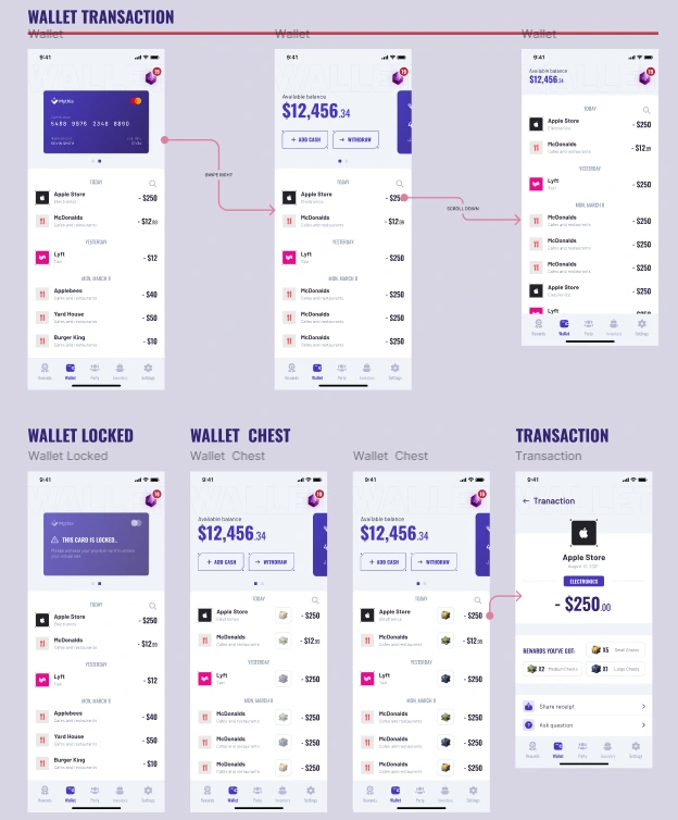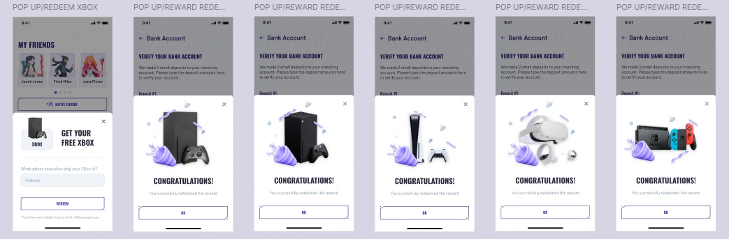 Develop user flows for various pages, including onboarding, rewards, games section, and interaction section with friends