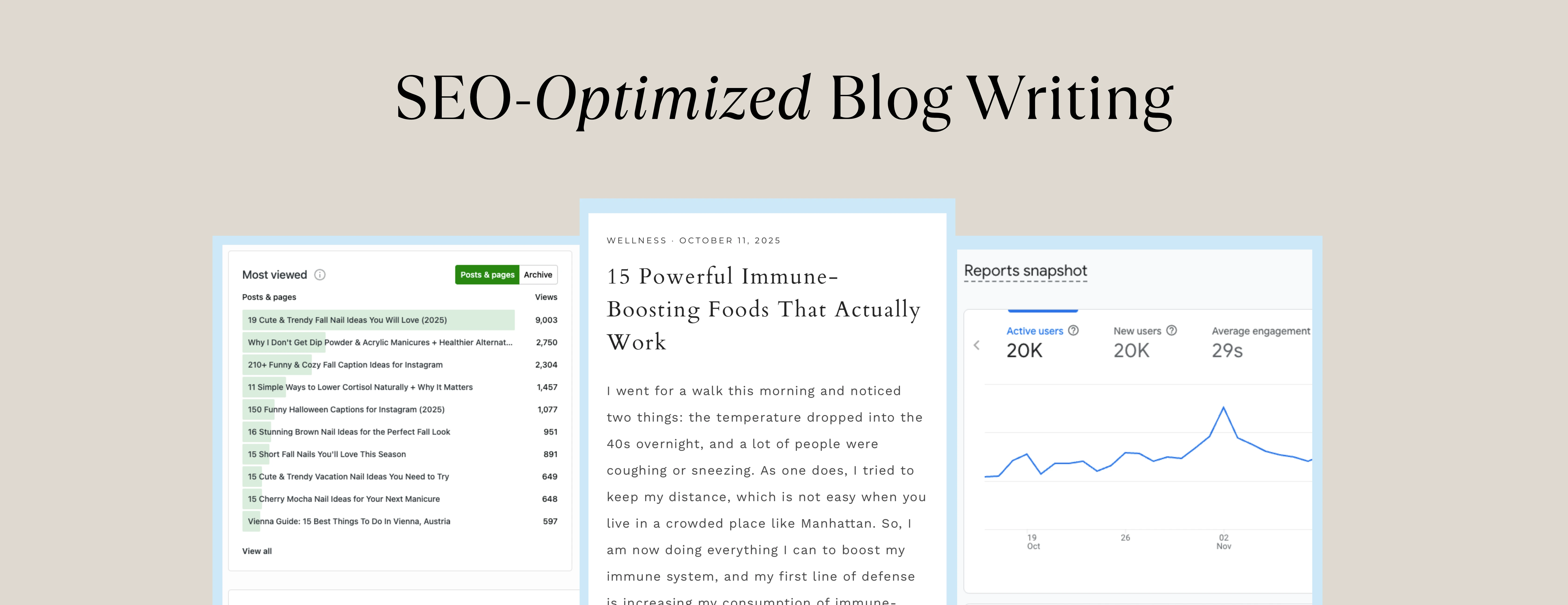 I write SEO-optimized blog posts that combine expert keyword strategy with a conversational, lifestyle-driven voice readers actually connect with.