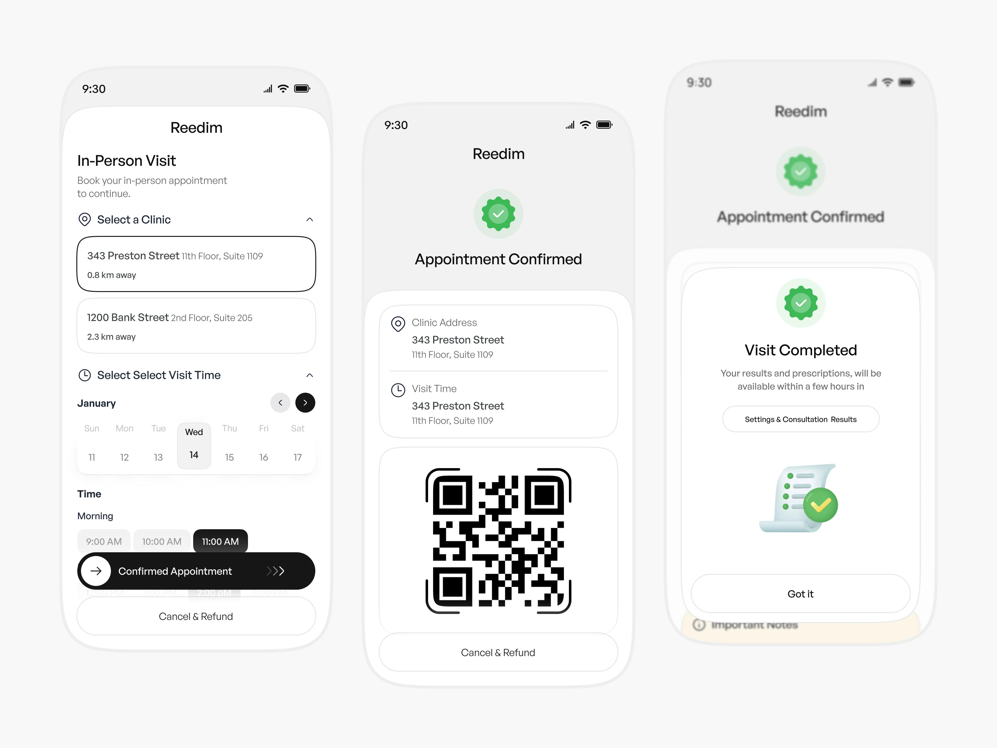 A clean and intuitive medical appointment booking app designed for seamless in-person clinic visits. The experience focuses on quick clinic selection, smart time-slot scheduling, QR code check-in, and clear appointment status, helping patients book and manage visits with ease.