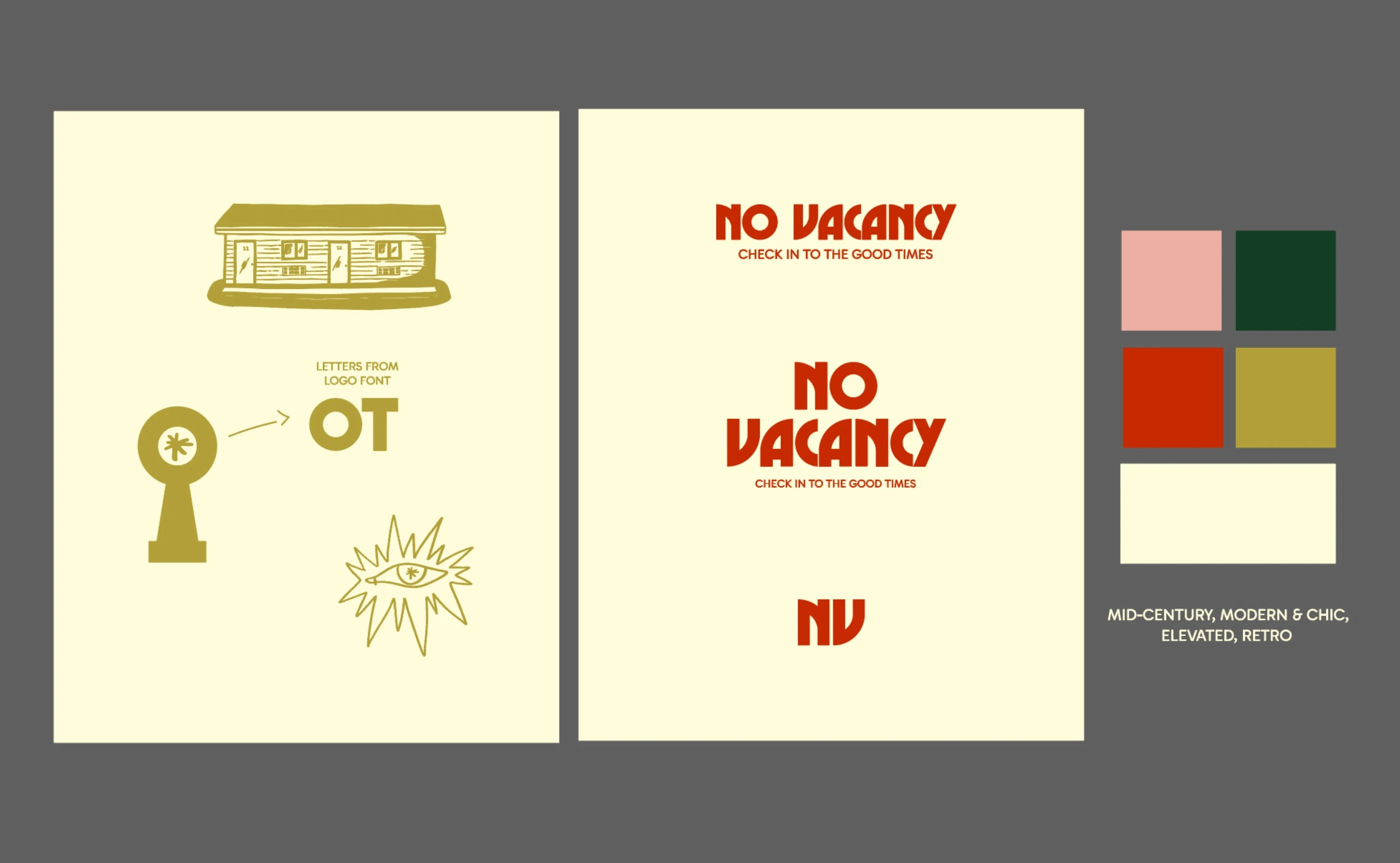 Roadside motels often lean heavily into nostalgia, kitschy retro cues, or overly literal mid-century references. The challenge was to avoid creating something that already exists. Instead of replicating a vintage motel aesthetic, the goal was to design a brand that feels mid-century in spirit while remaining fresh, modern, and relevant to today’s design-loving traveler.