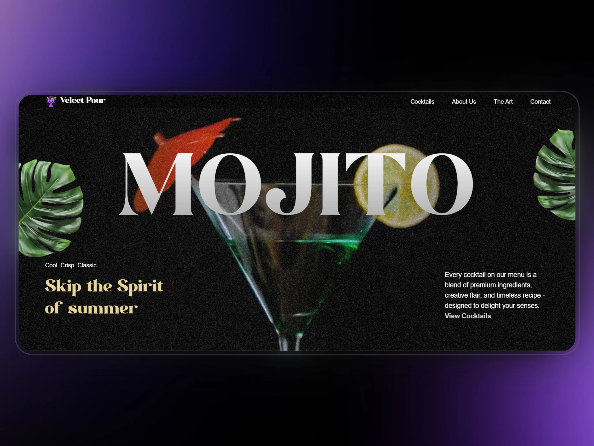 Mojito Cocktail is an interactive, visually rich web experience built with Next.js, React, and GSAP. The site combines smooth motion, dynamic transitions, and elegant layout to showcase a curated cocktail & mocktail menu. Key features include animated menus, image galleries, and transitions that respond as users scroll or navigate—bringing flavor and personality to every section. Built for both aesthetic appeal and performance, it delivers immersive storytelling through UI and motion.