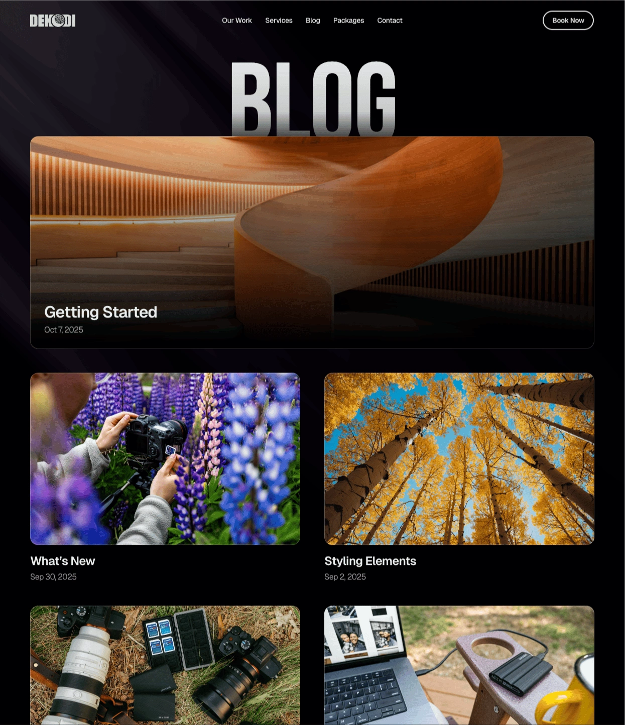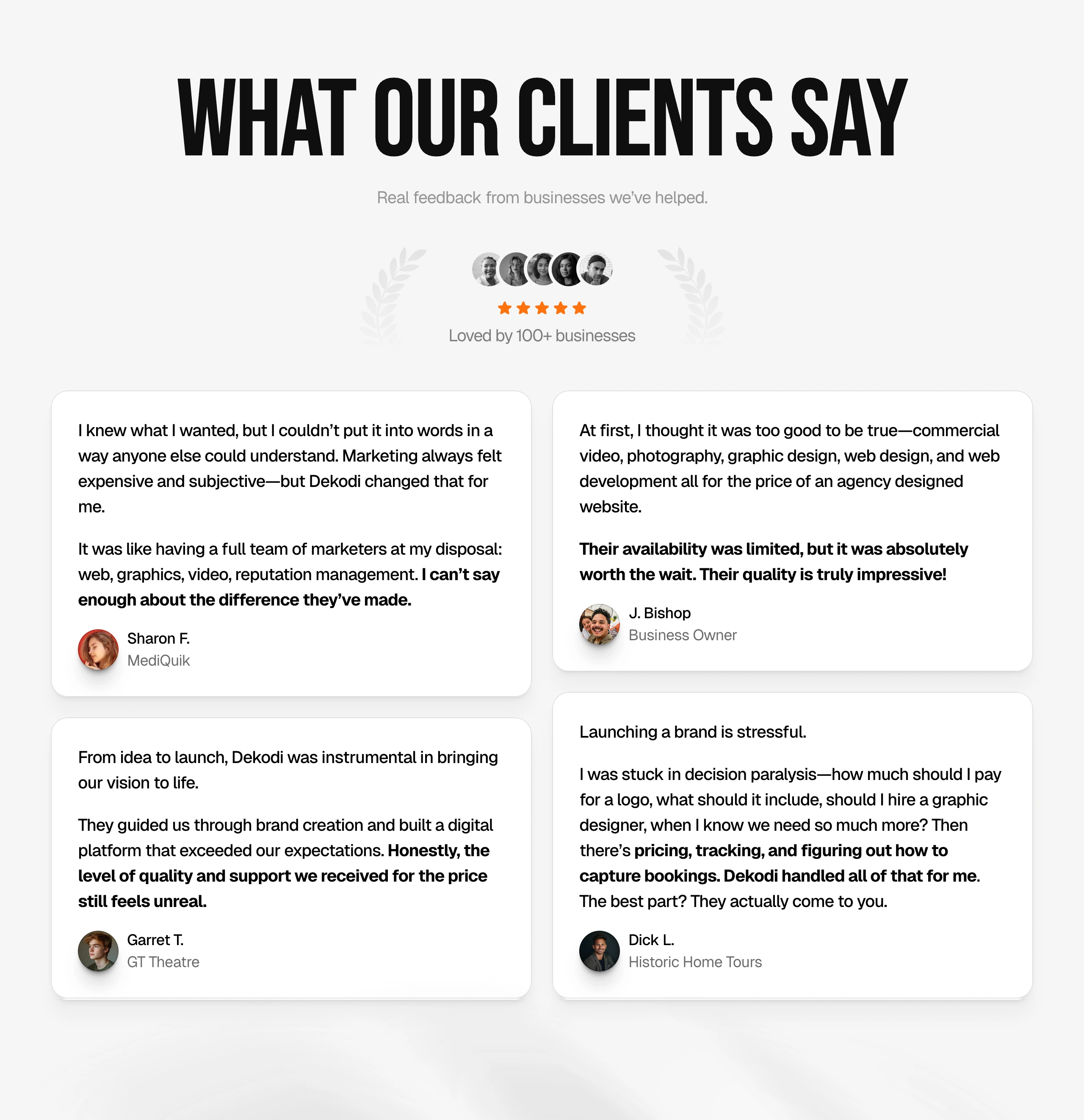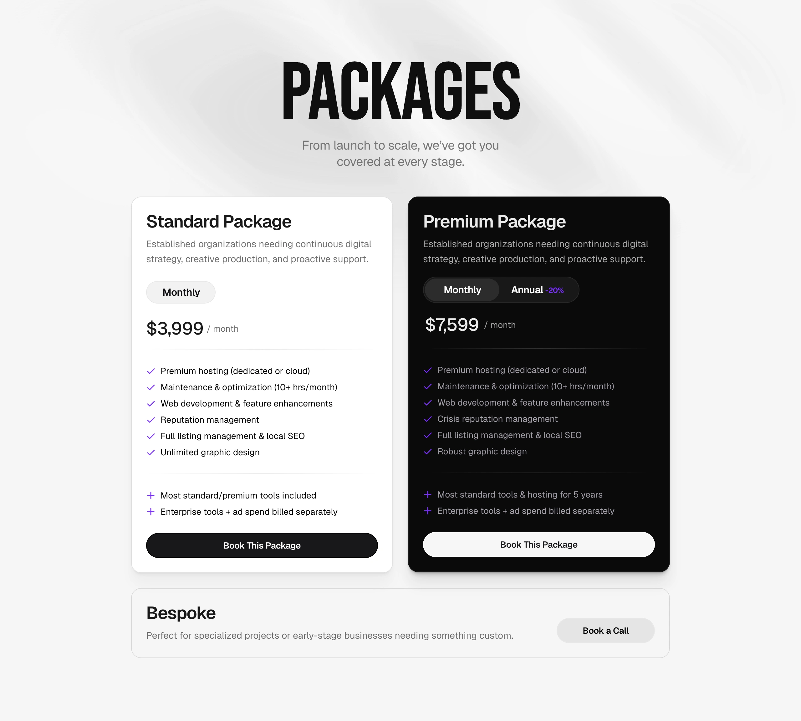 One-page agency website built in Framer showcasing creative and digital services including photography, videography, web design, reputation management, and SEO.