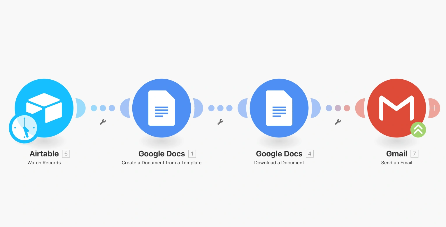 VantageReach Agency’s sales team spent time manually generating proposals. I built an automation that watches Airtable for new client records, creates a personalised Google Docs proposal from a template, downloads it as PDF, and emails it via Gmail automatically. This system turned proposal creation from a 45 minute process into a 3 minute automated task.