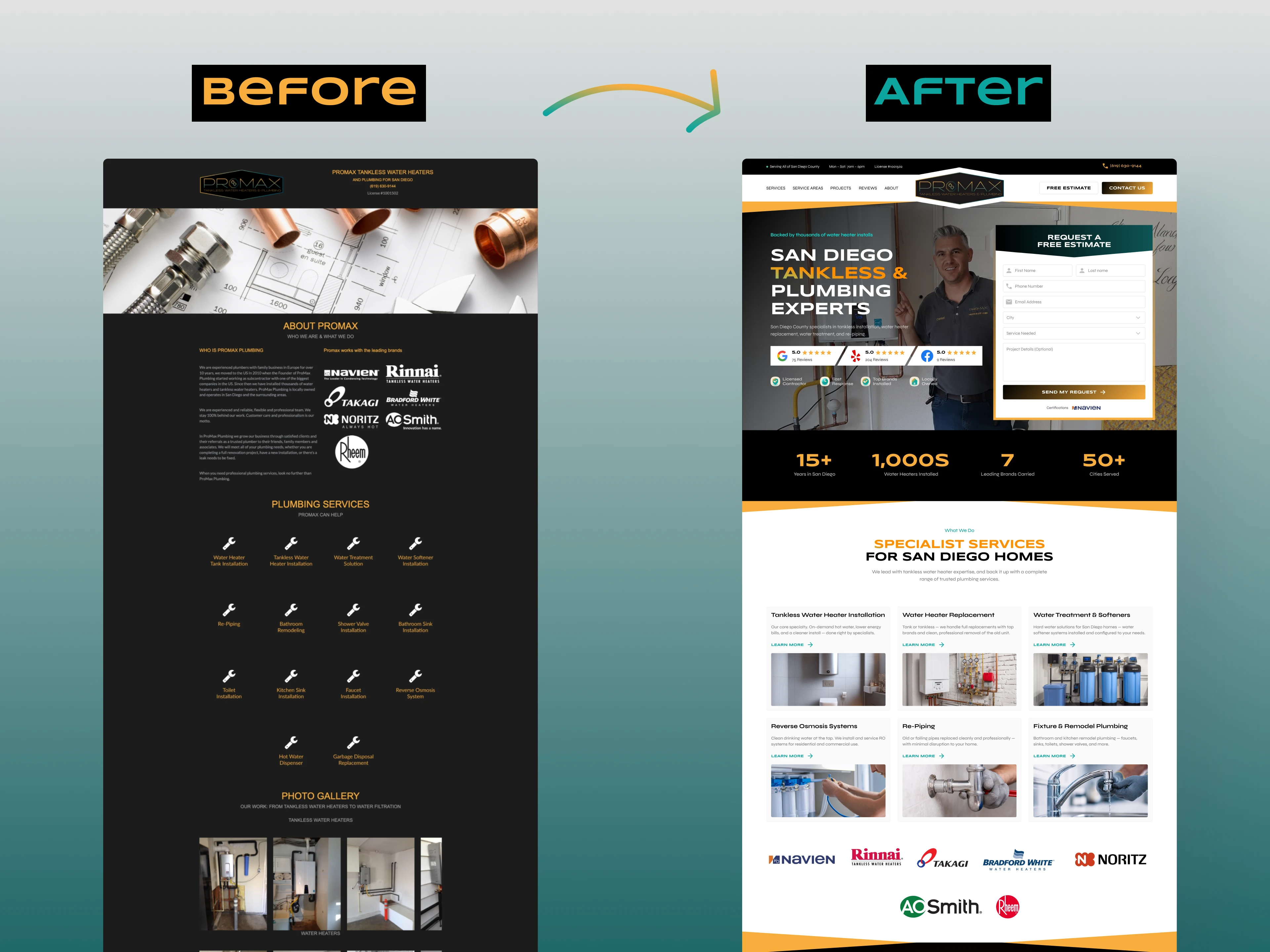 I structured the page around the way a real homeowner scans a service site. I placed the estimate form in the hero, added review proof and service stats near the top, then built out specialist service cards for tankless installation, replacement, water treatment, reverse osmosis, repining, and fixture work. I also included trust sections for brands, completed projects, customer reviews, service areas, process steps, FAQ, and a final contact form.