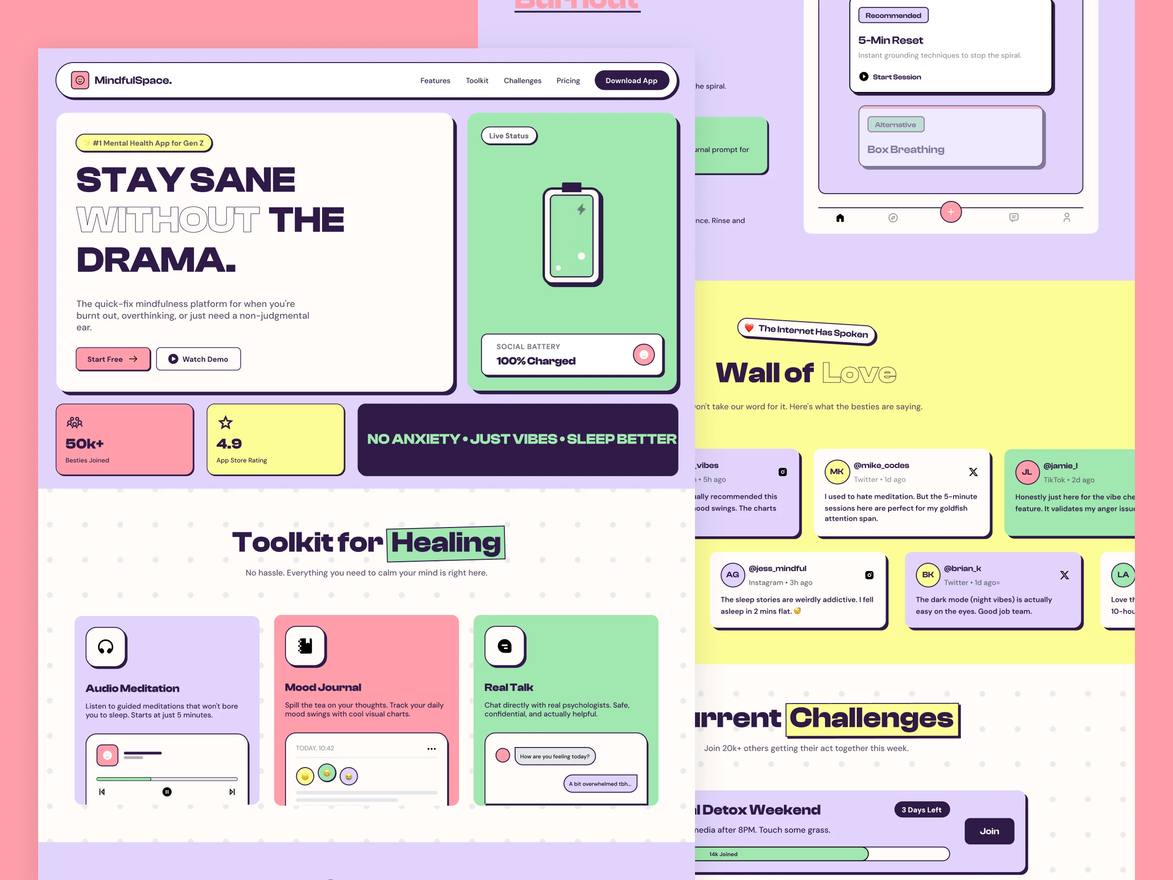 A landing page for a mindfulness app, designed to explain the toolkit fast, build trust, and drive sign ups with clear CTAs.