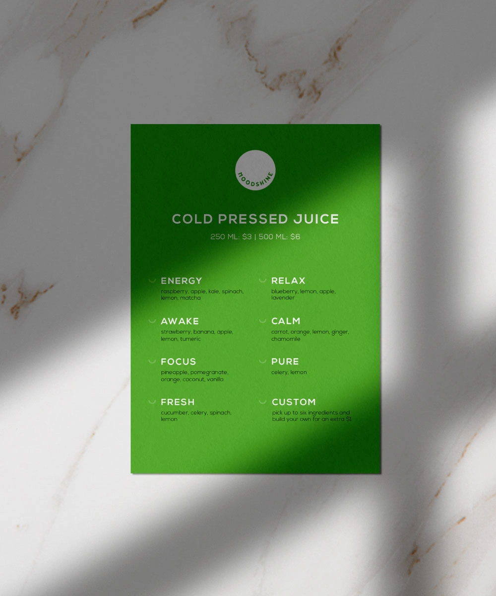Moodshine Juice is a cold-pressed juice company that inspires and nurtures the human spirit, one juice at a time! They are dedicated to creating a healthier world by making grab-n-go drinks that taste just as good as they make you feel. Each juice is named after a different feeling you would get from drinking it and absorbing all the wholesome ingredients.