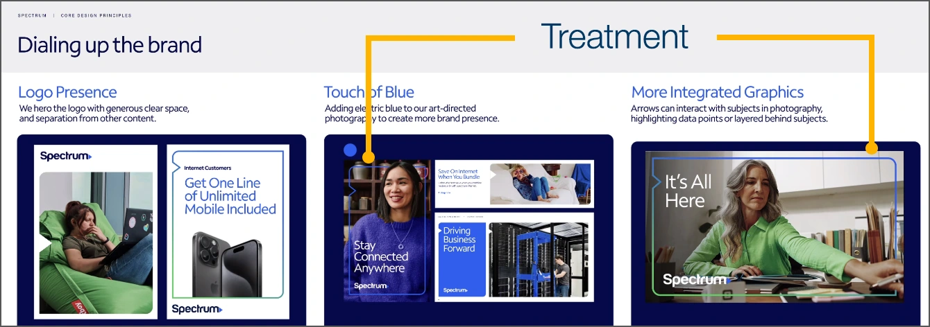 The Spectrum Business team enjoyed the treatment from the first concept. It was simple and clean, and yet new. They thought it was a great treatment, so they decided to use it for their overall soft rebrand.