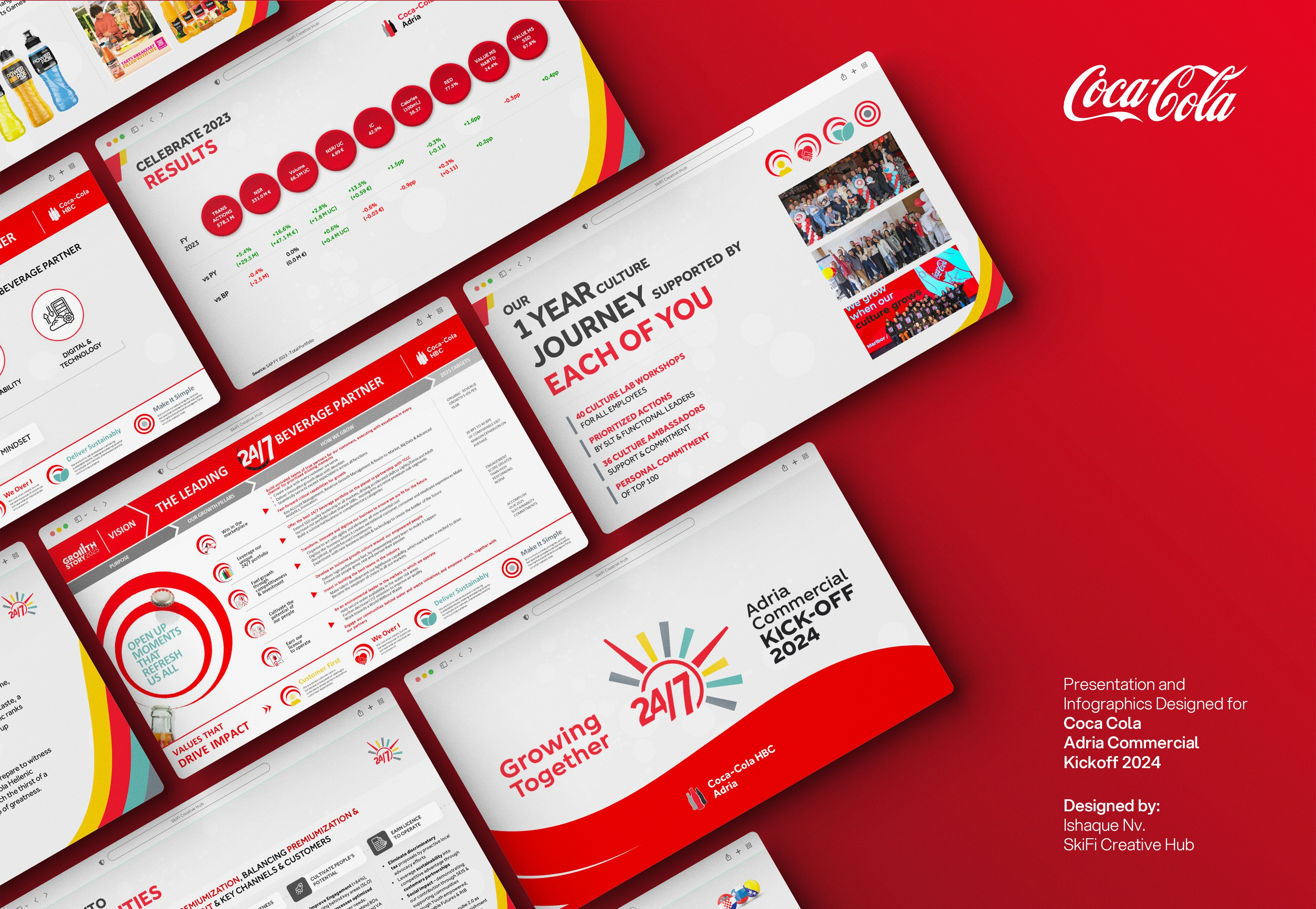Designed a dynamic presentation for Coca Cola Adria, blending brand identity with clear storytelling to support impactful campaigns and client pitches.