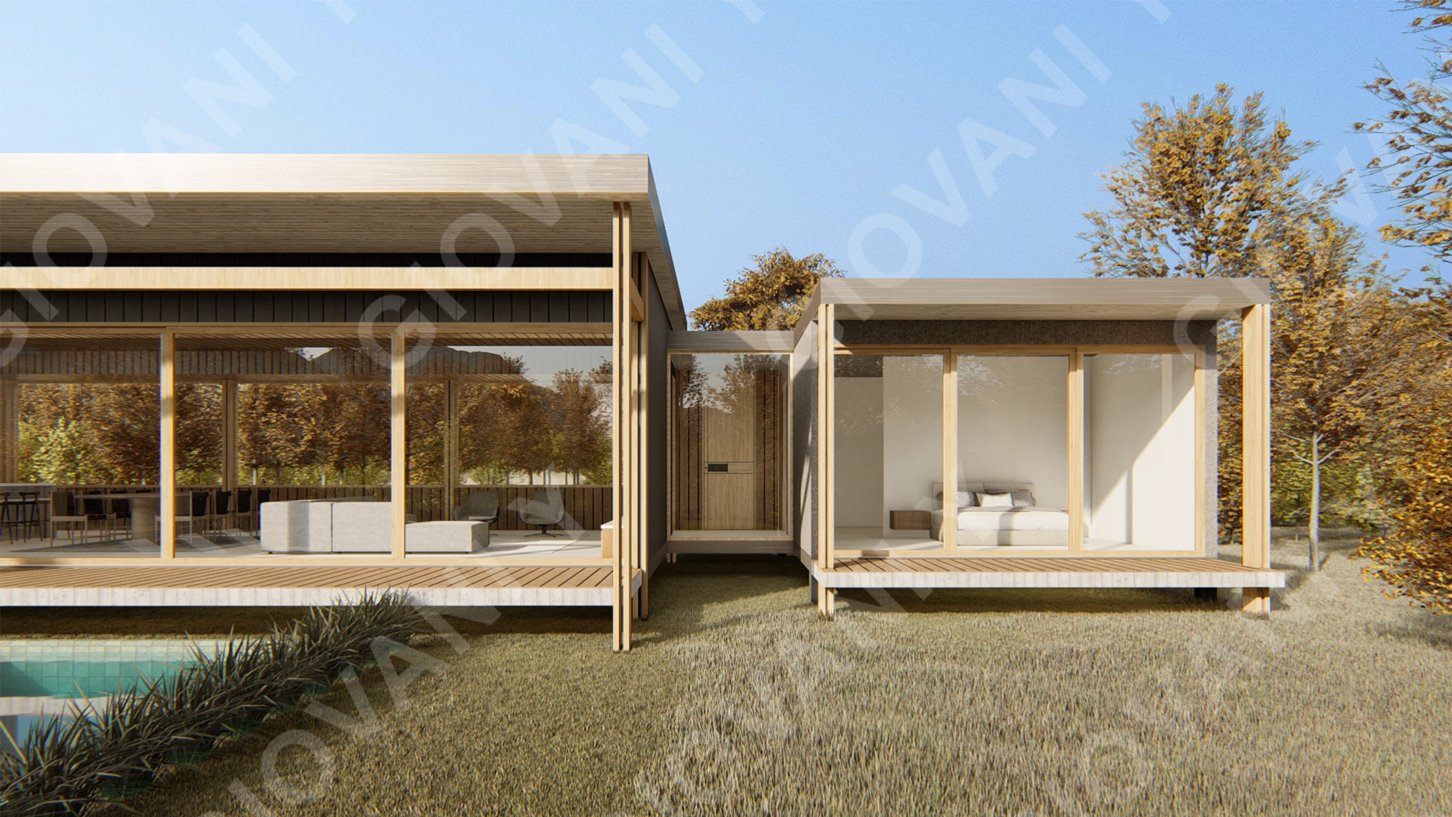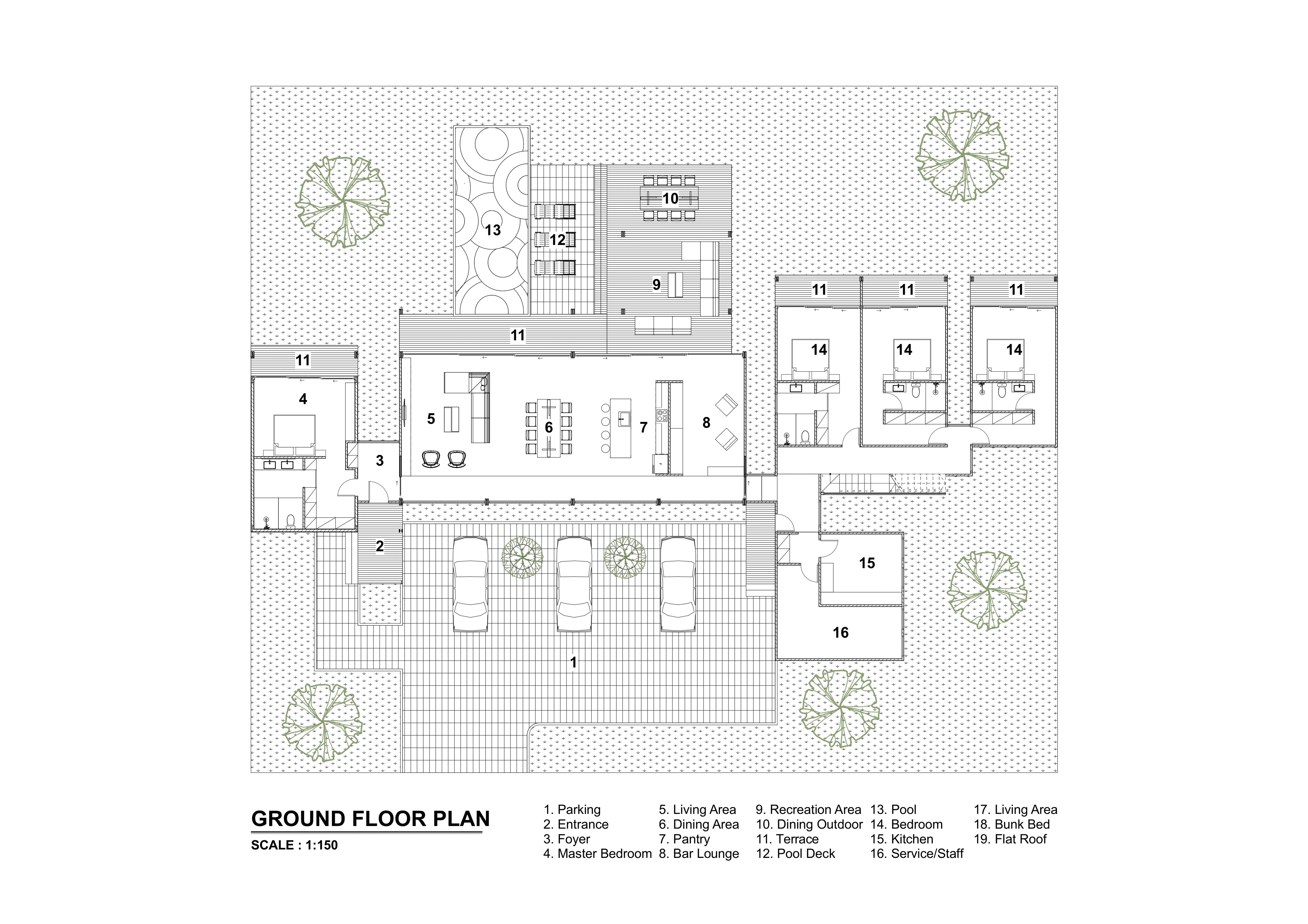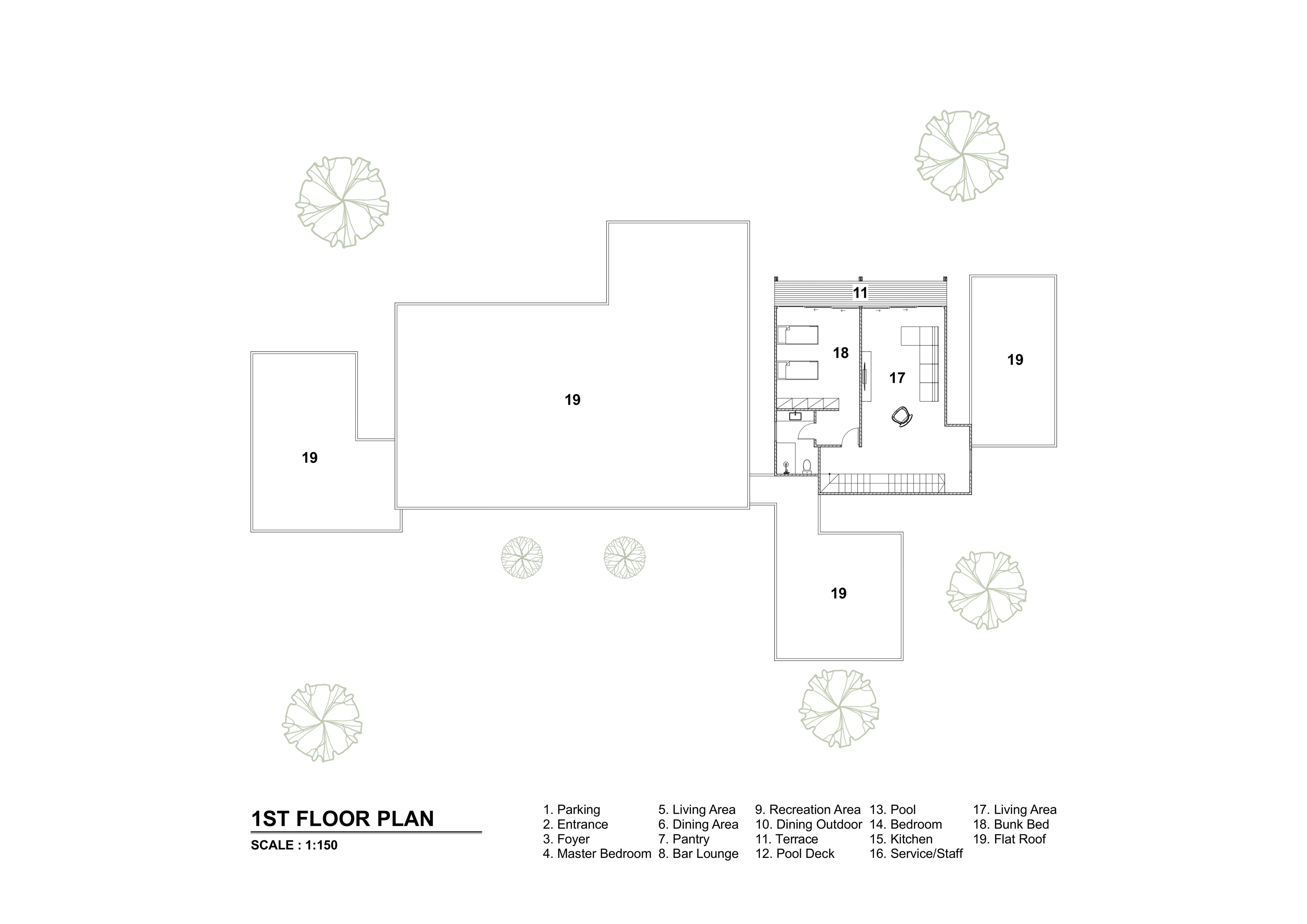 In general, the building is divided into four areas: the master bedroom, public area, small rooms, and service area. All of these are connected by connectors such as bridges. This is to emphasise the transition between spaces, creating a different spatial experience.