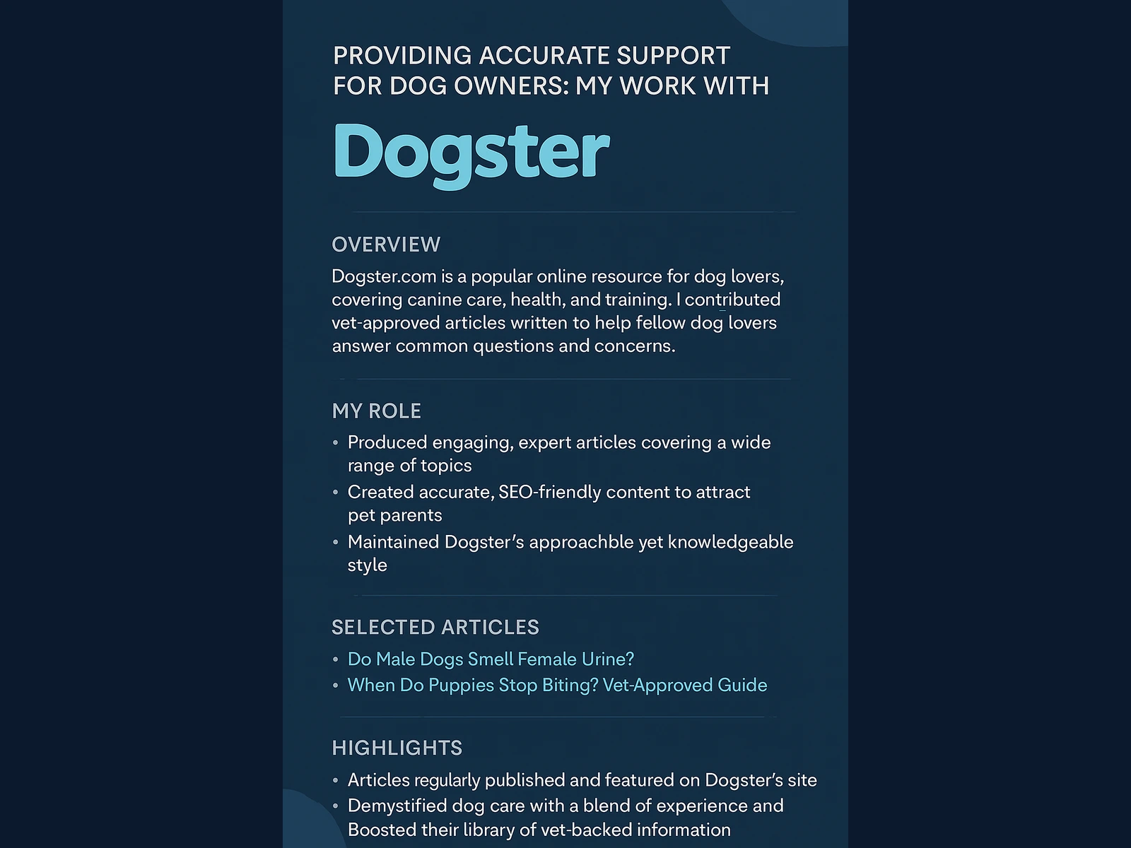 Drafted in-depth, SEO-aligned articles Simplified complex vet terminology for general audiences Fact-checked all content to ensure scientific reliability