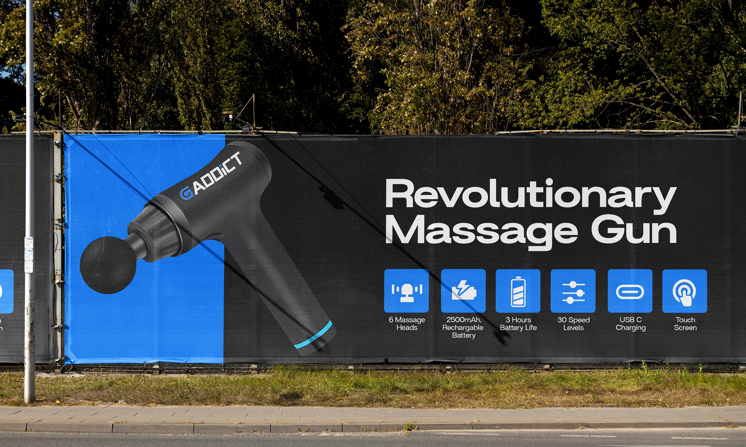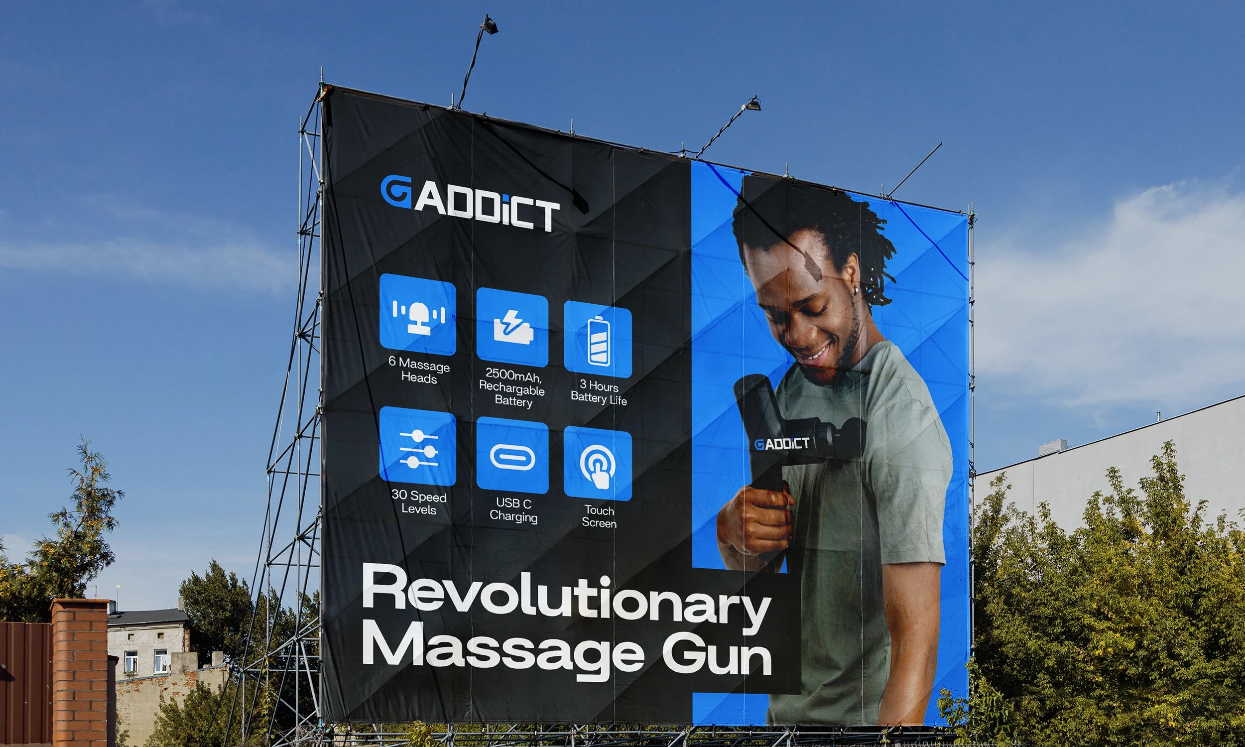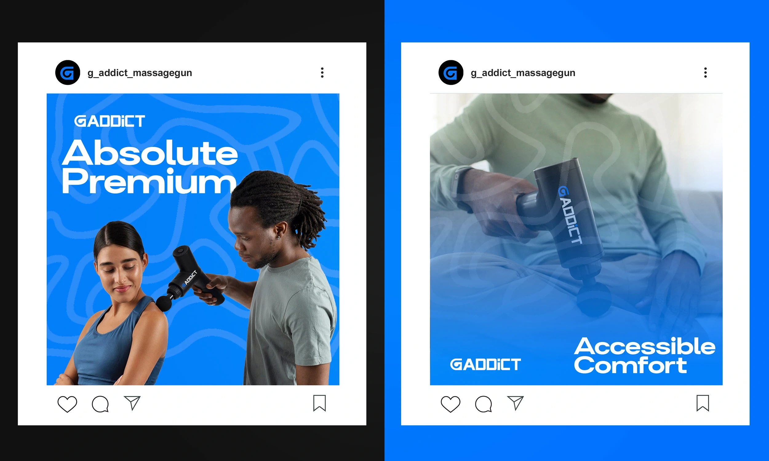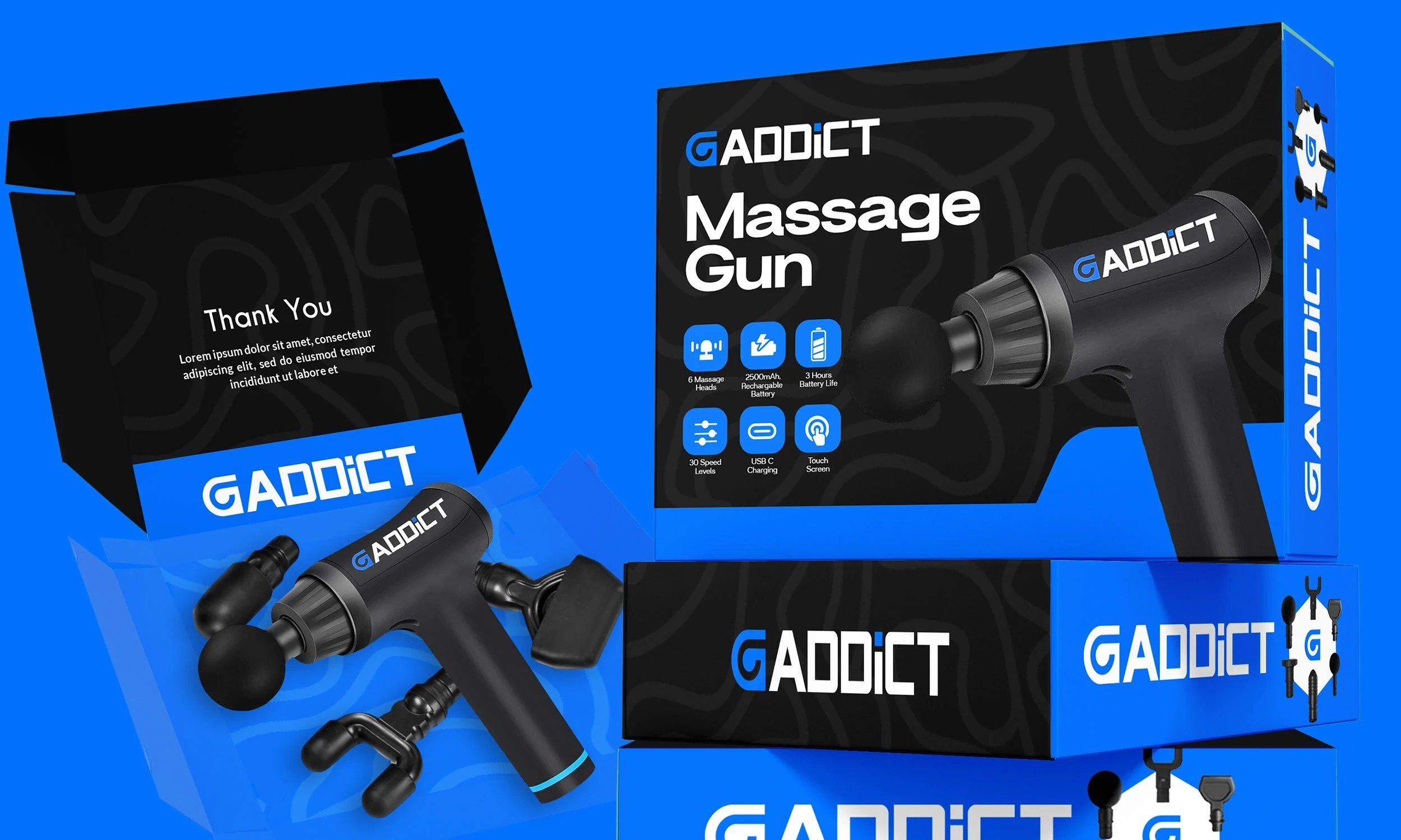 I crafted the brand identity for GAddict, a massage gun brand built around performance, recovery, and tech-driven wellness. The name suggests a passion for peak physical care, so the logo was designed to feel sleek and energizing—bold typography with dynamic forms that echo motion and vibration. The visual language combines strength and relief, appealing to athletes, fitness enthusiasts, and everyday users looking to invest in their recovery. From the brandmark to packaging direction, the identity speaks to power, precision, and modern self-care.