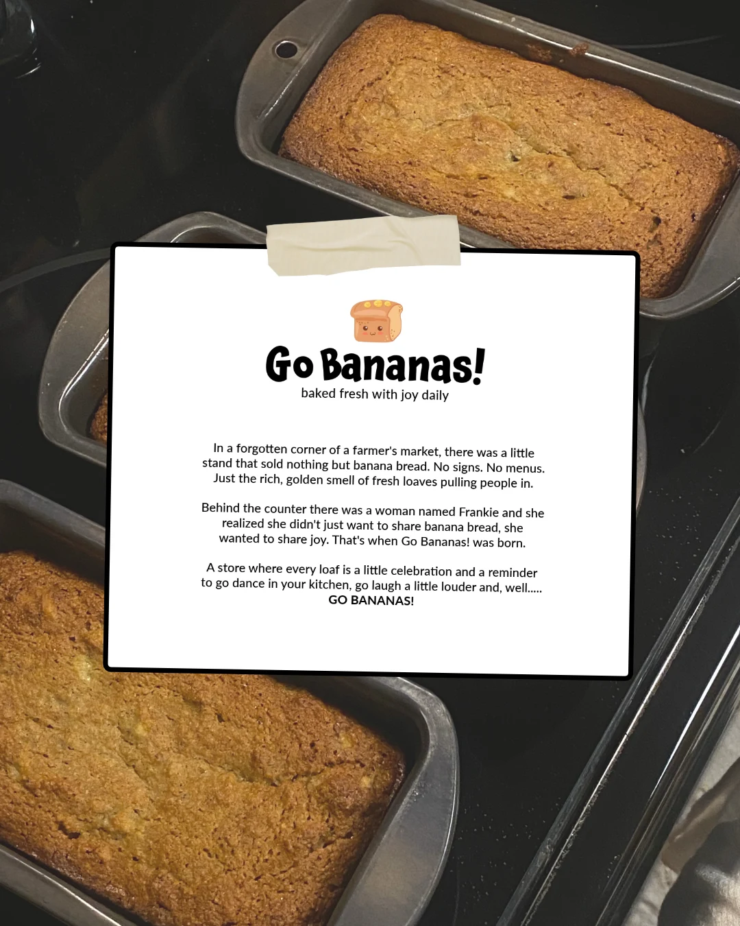Go Bananas! Is a small shop where every loaf of banana bread is made with a little celebration, a little joy, and made fresh daily.