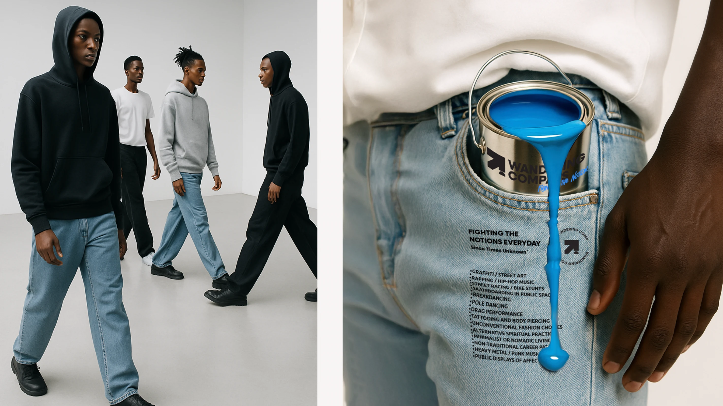 While this route wasn’t the final direction taken, it laid the groundwork for a brand that could truly live on the streets and in the culture, not just on shelves. It positioned Wandering Compass as more than clothing but as a platform for individuals who reject the polished path and embrace the freedom of their compass. A concept built not just to wear, but to live in.