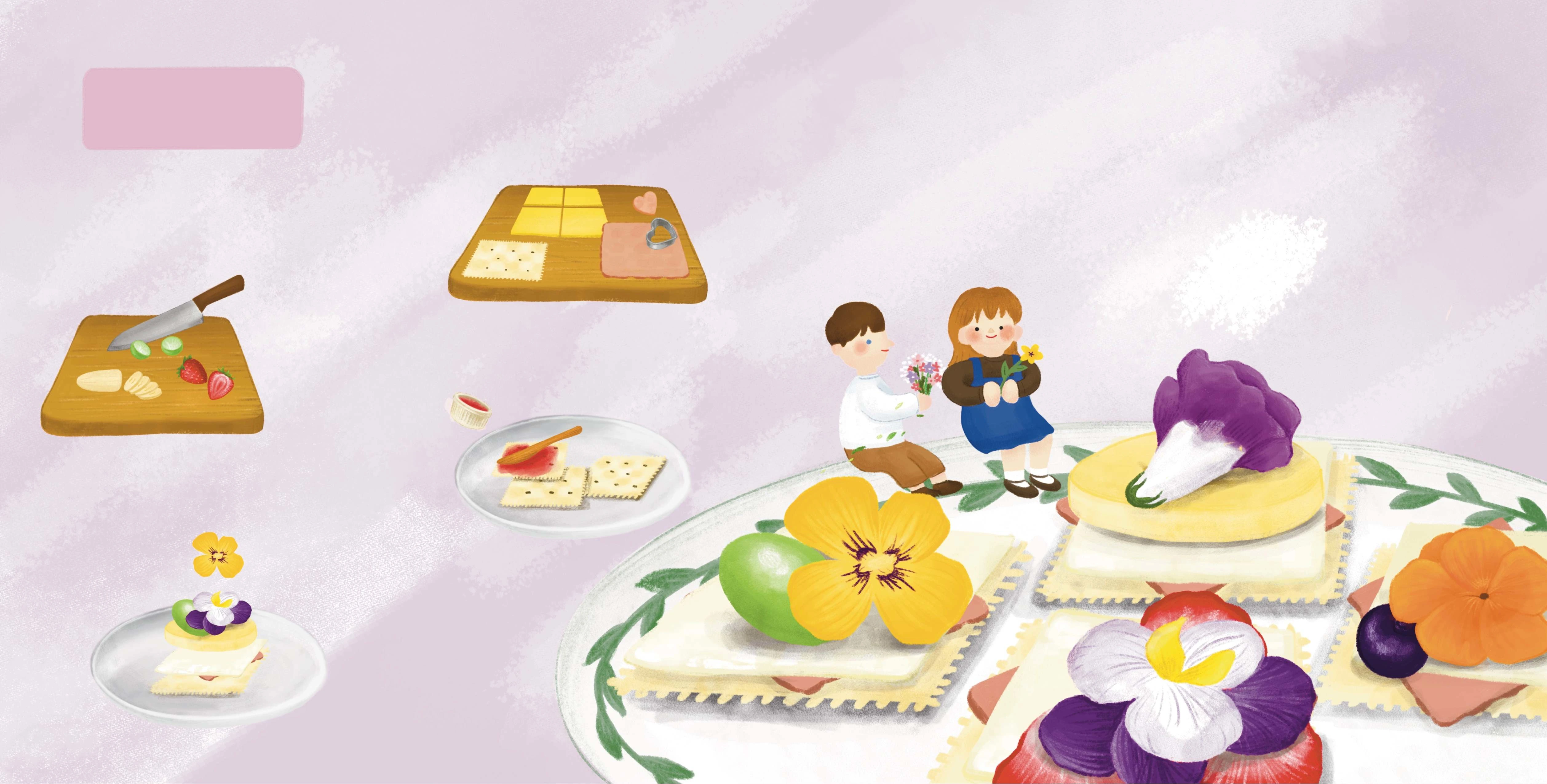 Digital illustration depicting the process of making flower crackers with Maldives cuisine among children's world cooking recipe picture books