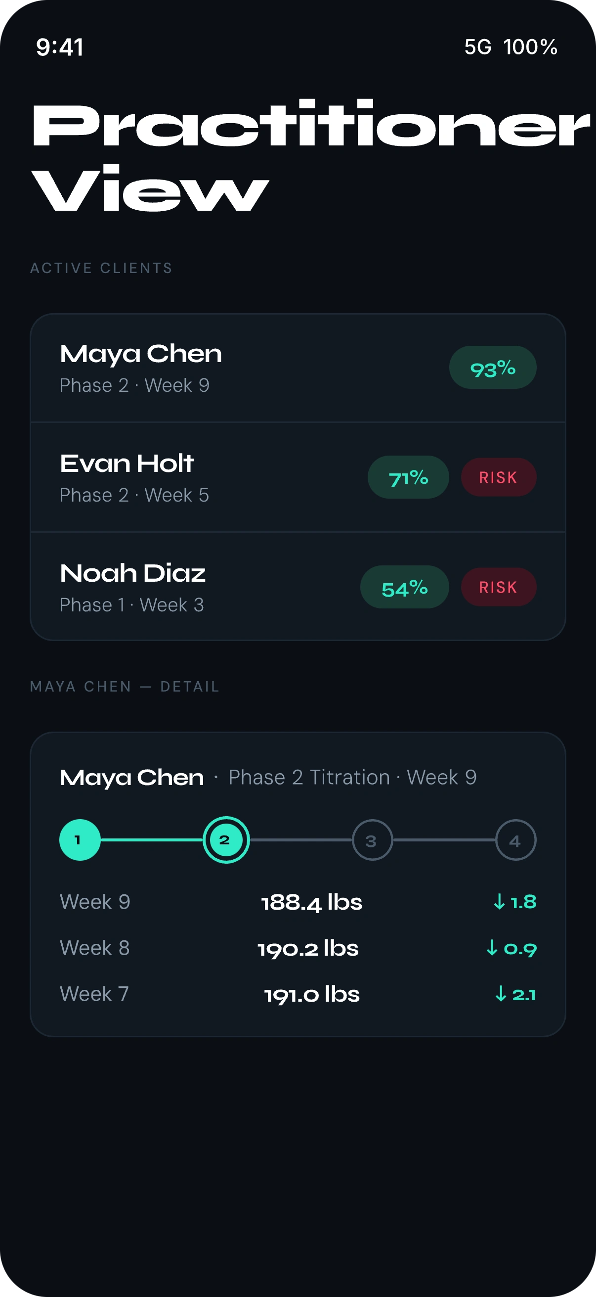 Clinicians using Phasio get a dedicated view designed for caseload management, not personal tracking. At a glance they can see all active clients, their compliance percentages, and any flagged risk patients — with the ability to drill into any individual's week-by-week data.