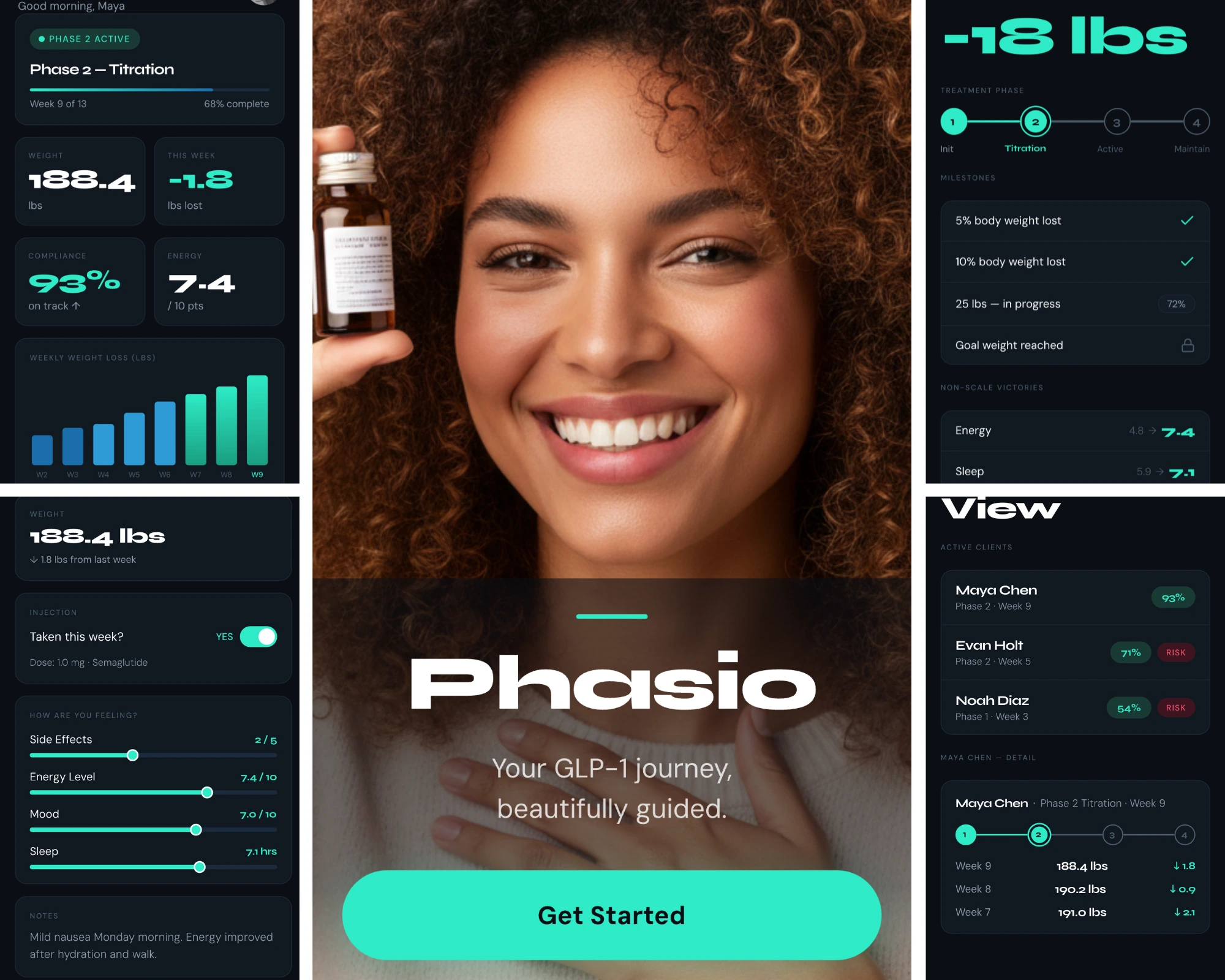 The Phasio app serves two distinct user types: patients tracking their GLP-1 journey week by week, and practitioners monitoring multiple clients. We designed these as two coherent views within the same app — unified by the design system, but tailored to each user's needs.