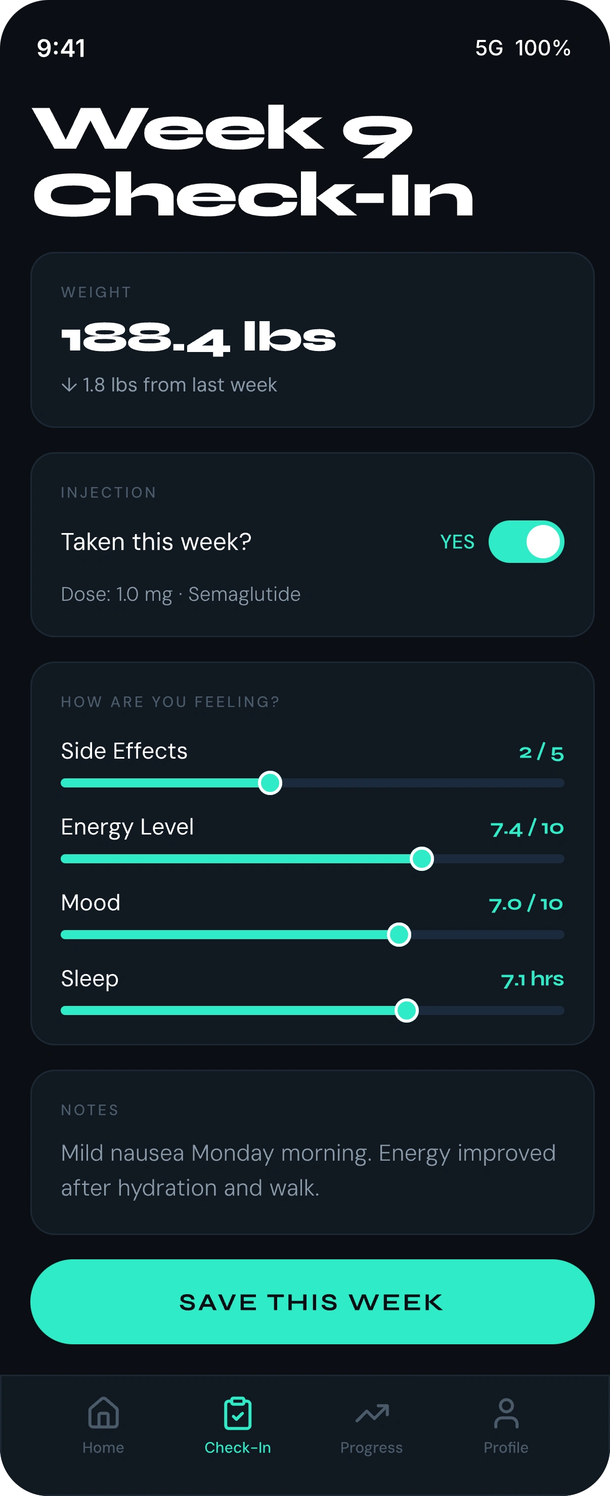 Every week, patients log their weight, confirm their injection, and rate their wellbeing across four dimensions — side effects, energy, mood, and sleep. Slider inputs feel tactile and honest. Notes let patients add context in their own words. The whole flow takes under 90 seconds.