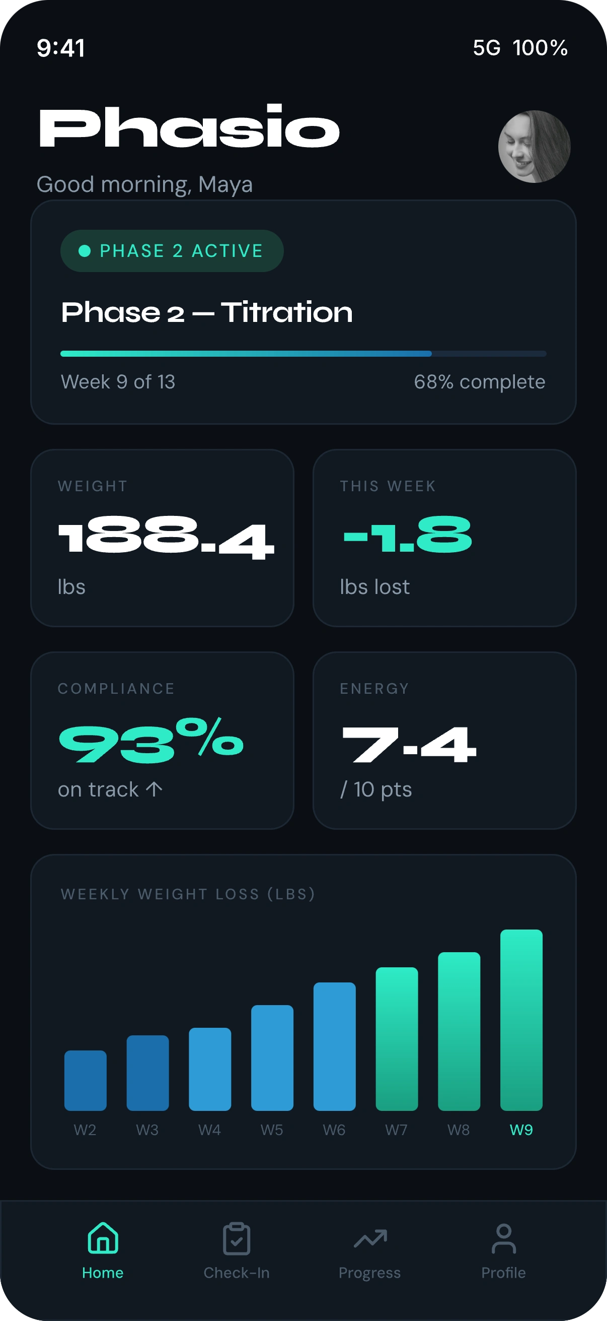 The home screen immediately orients the patient. Phase status, current weight, weekly delta, compliance score, and energy level are all visible above the fold. A weekly bar chart brings the trajectory to life — showing not just where you are, but how far you've come.