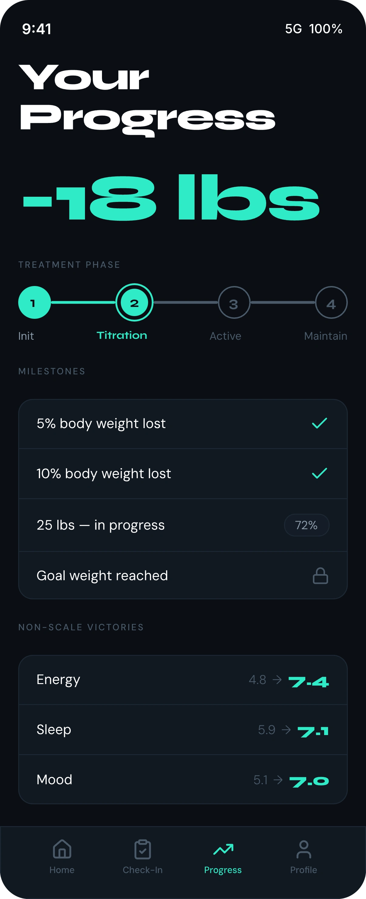 The progress screen transforms raw data into a narrative. Patients see their phase on a treatment roadmap, celebrate milestones (5%, 10%, 25 lbs), and track non-scale victories like energy and sleep improvements — critical motivators that weight alone can't capture.