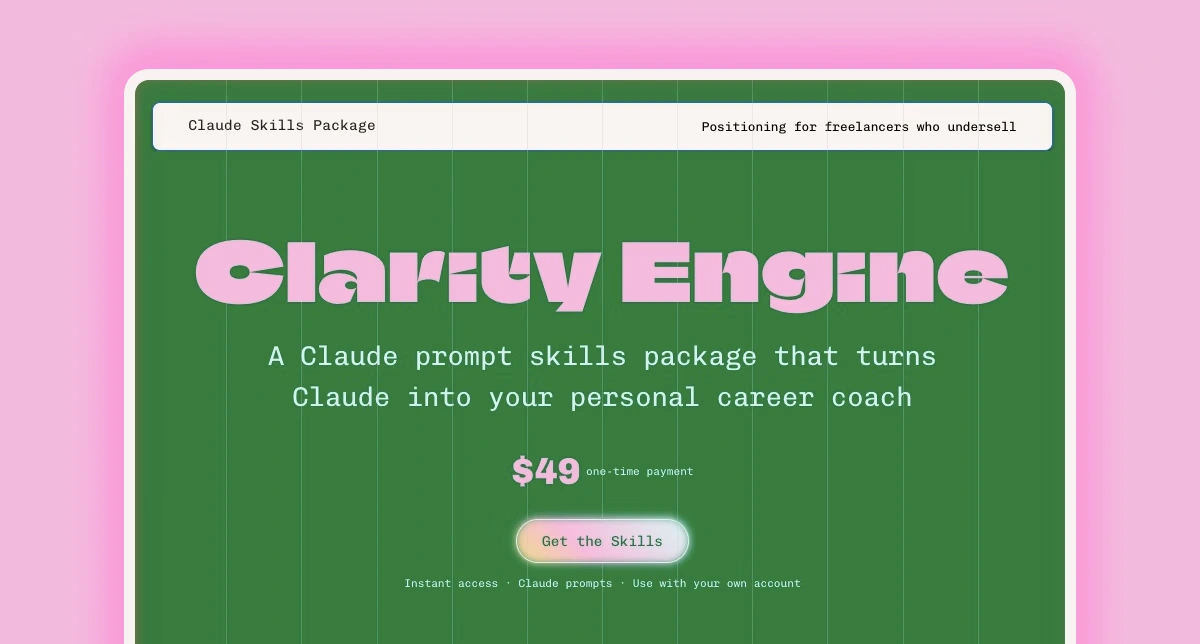 Clarity Engine is a suite of 7 AI career coaching skills that help you overcome impostor syndrome and create positioning that lands $100/hour clients.