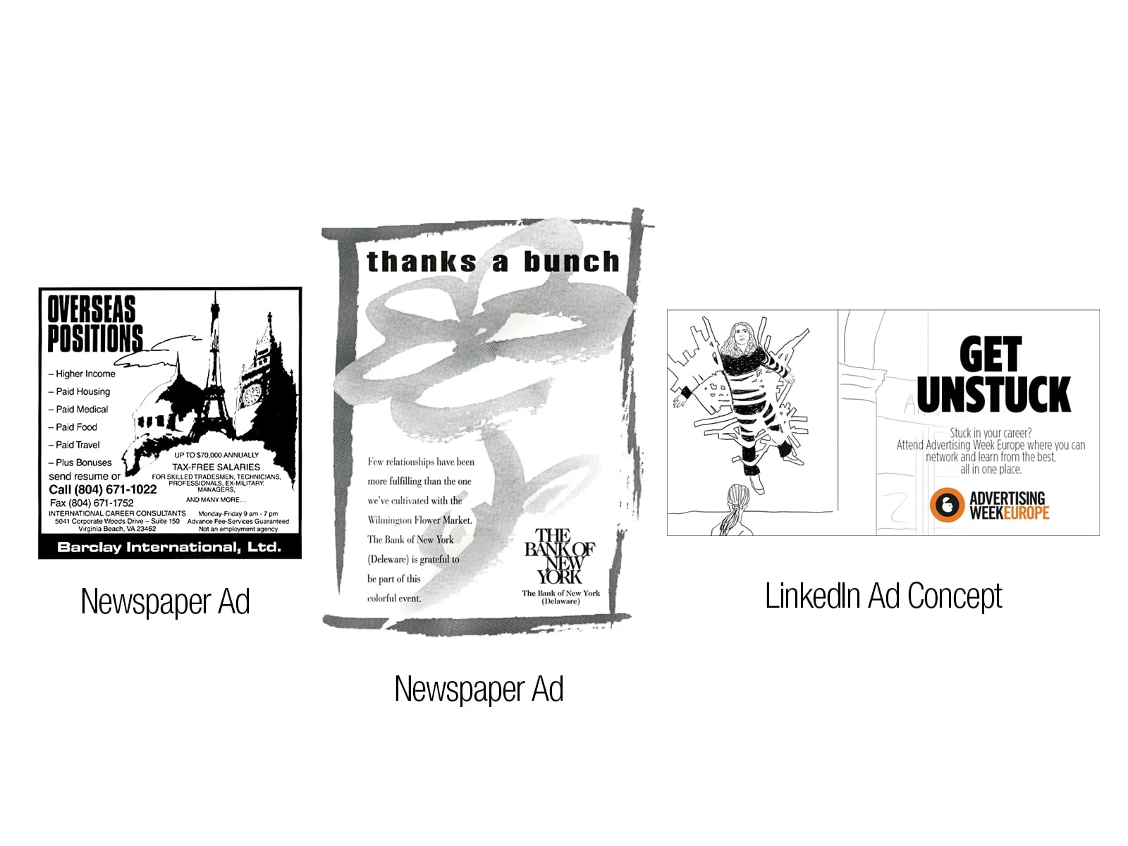 Newspaper and Social Media advertising for a variety of clients. The ad for AWE was a stunt, as well.