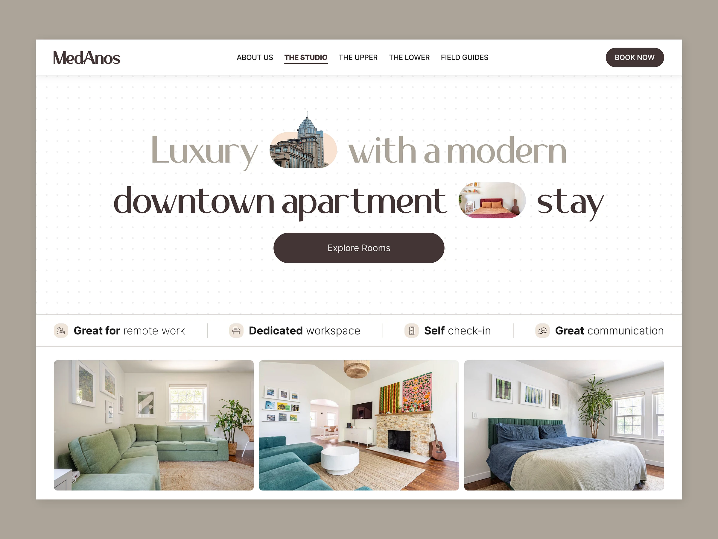 The design features a minimalist layout, elegant typography, and a neutral color palette to focus on the beautiful interior photography. Key features like "Dedicated workspace" and "Self check-in" are prominently highlighted to appeal to travelers & remote workers looking for a premium, seamless stay.
