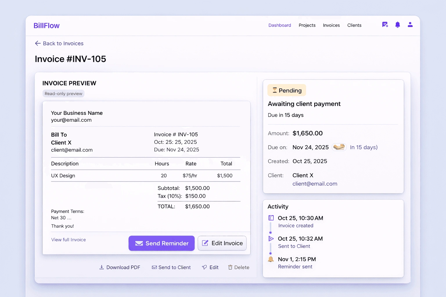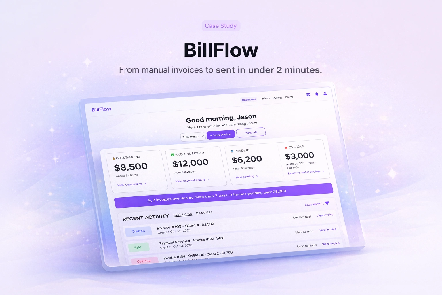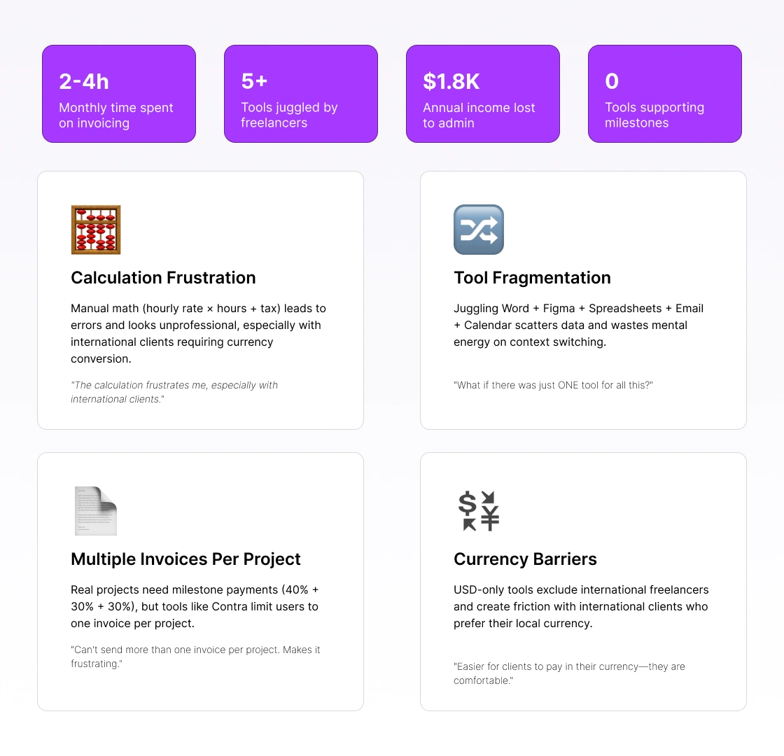 BillFlow transforms freelancer invoicing from a 20-minute burden into a 2-minute streamlined process.