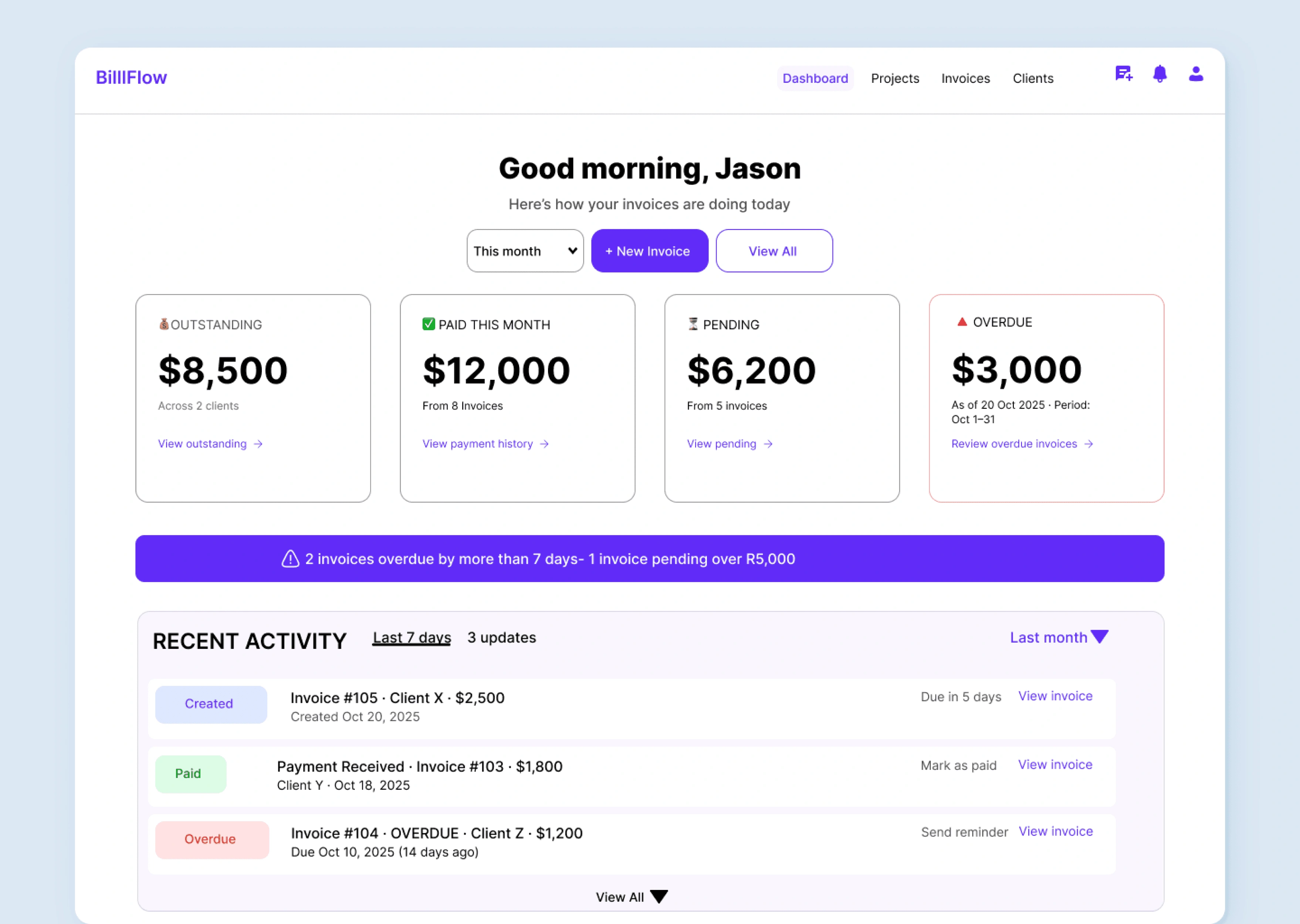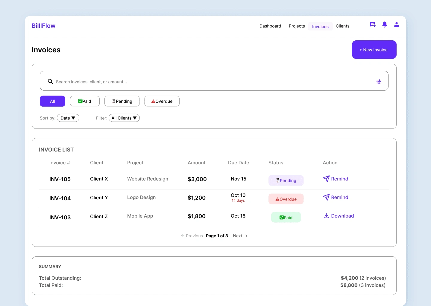 ### Users understand invoice status in 3 seconds. Key metrics are prioritized with color-coded cards, and overdue invoices are visually stronger to drive immediate action.