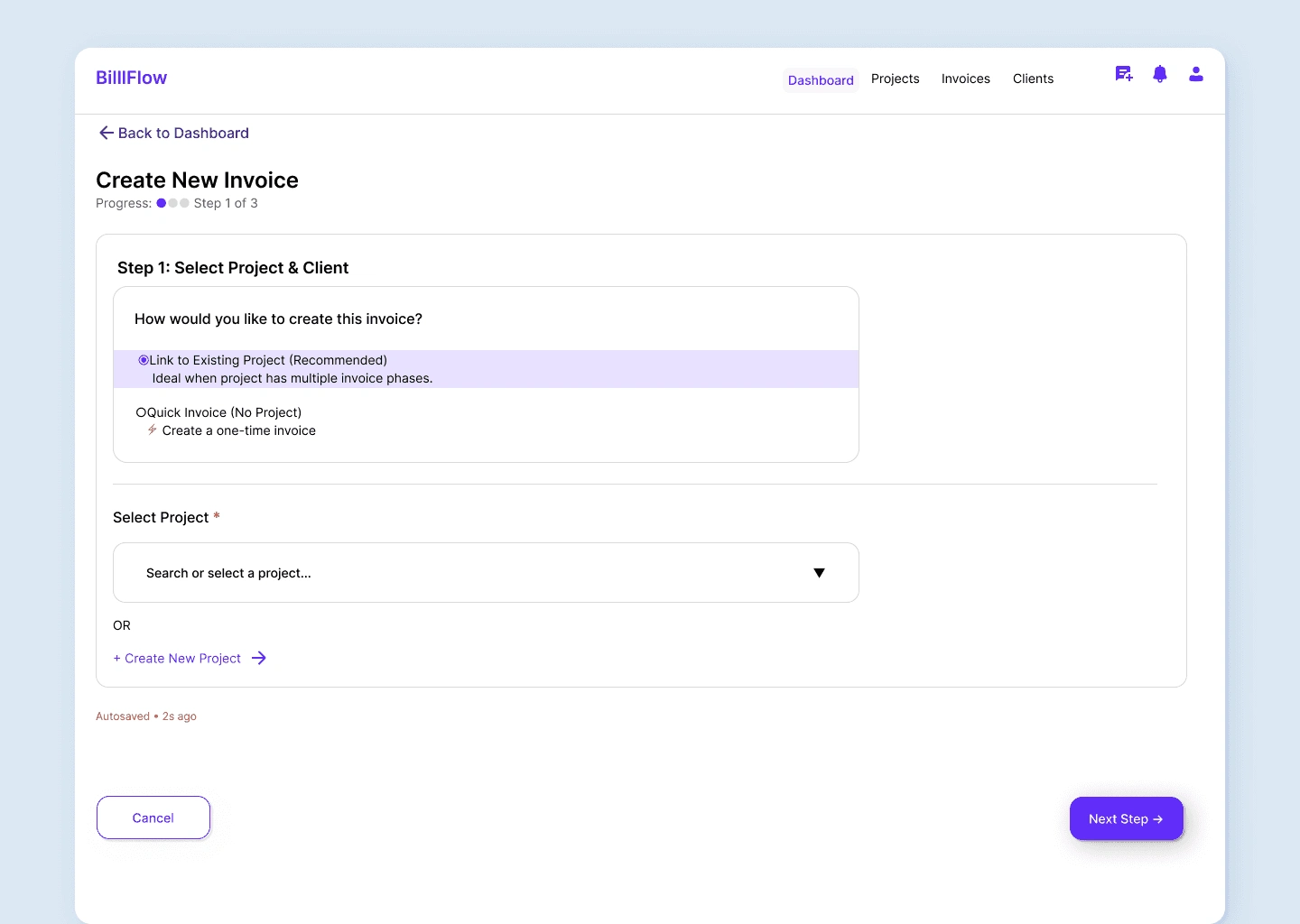 Support both quick one-off invoices and milestone-based projects. Smart defaults reduce effort for repeat clients, while the stepped approach prevents cognitive overload.