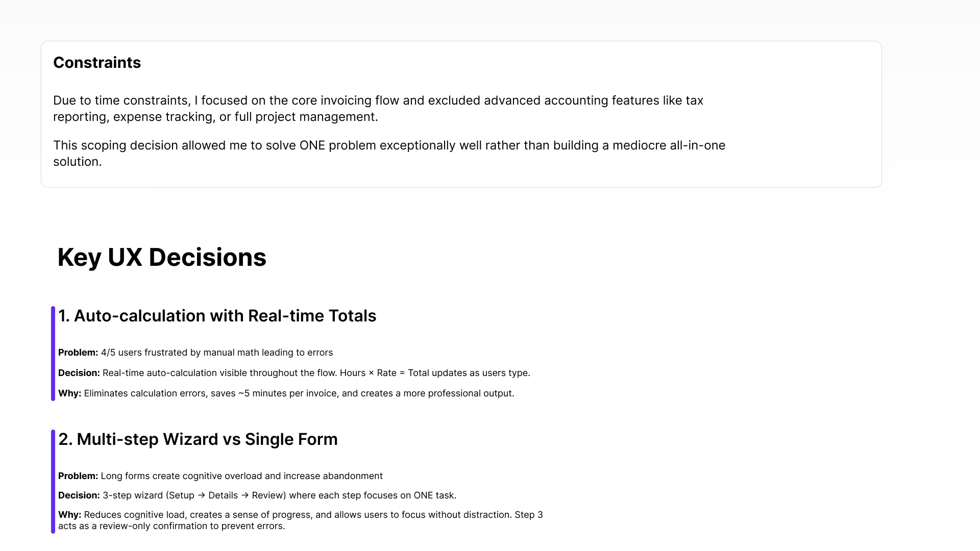 • Focusing on ONE problem (invoicing) instead of trying to build full accounting software allowed for deeper solution