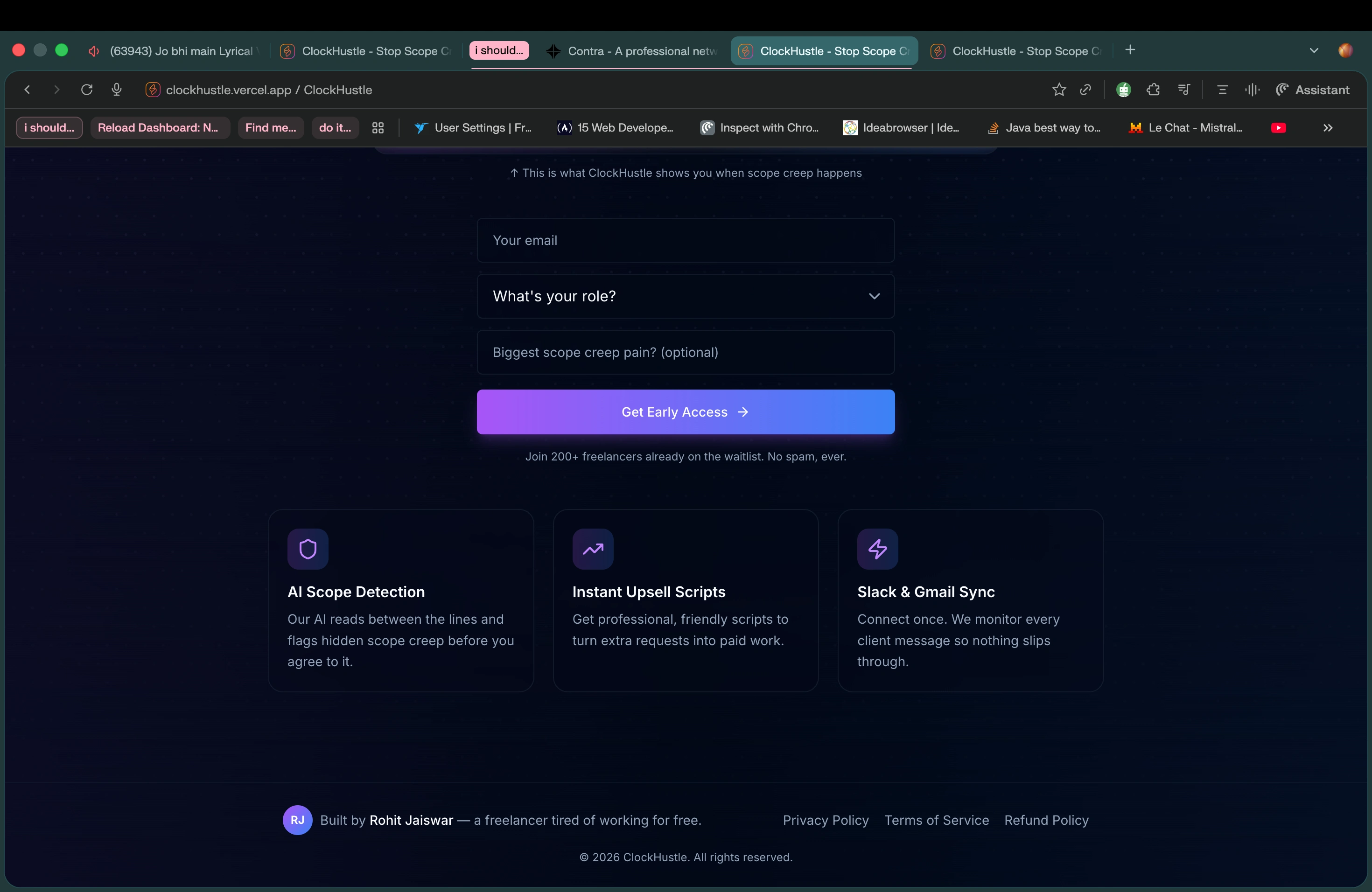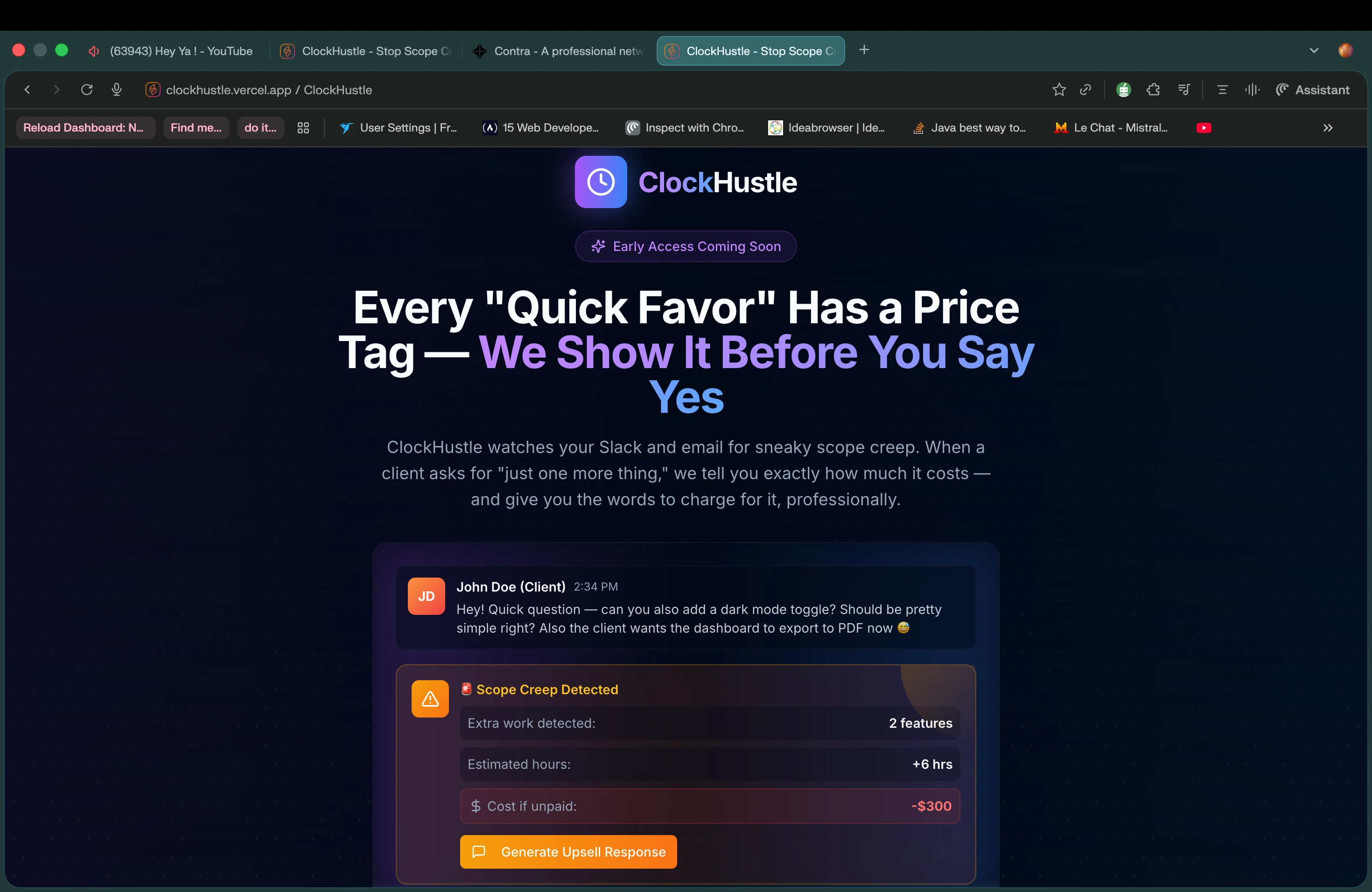 My SaaS startup detects scope creep via AI. Monitors Slack/Gmail and auto-generates upsell scripts. Built with Next.js and Firebase. 200+ on the waitlist.