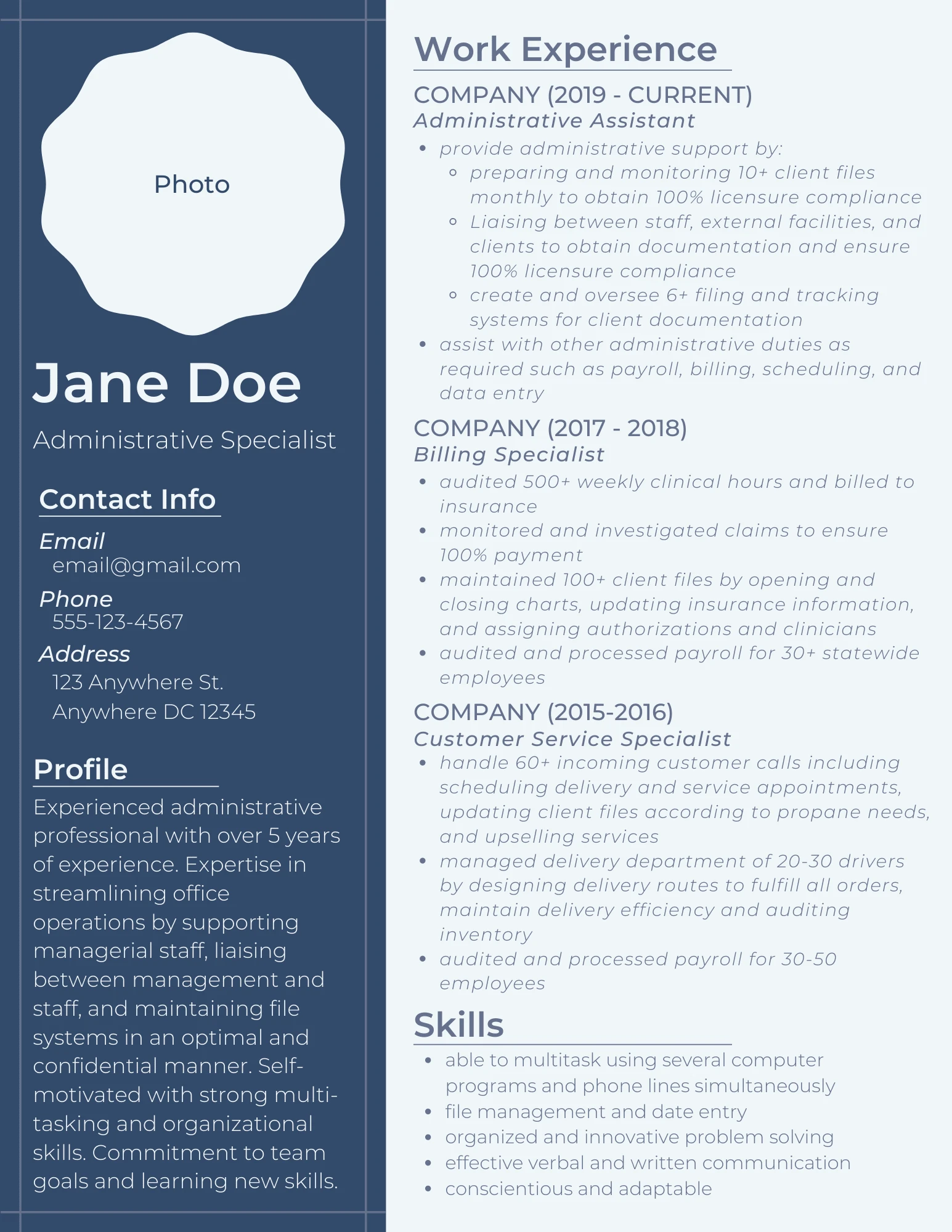 This is a mockup of a resume for an administrative position. It is based on my own history.