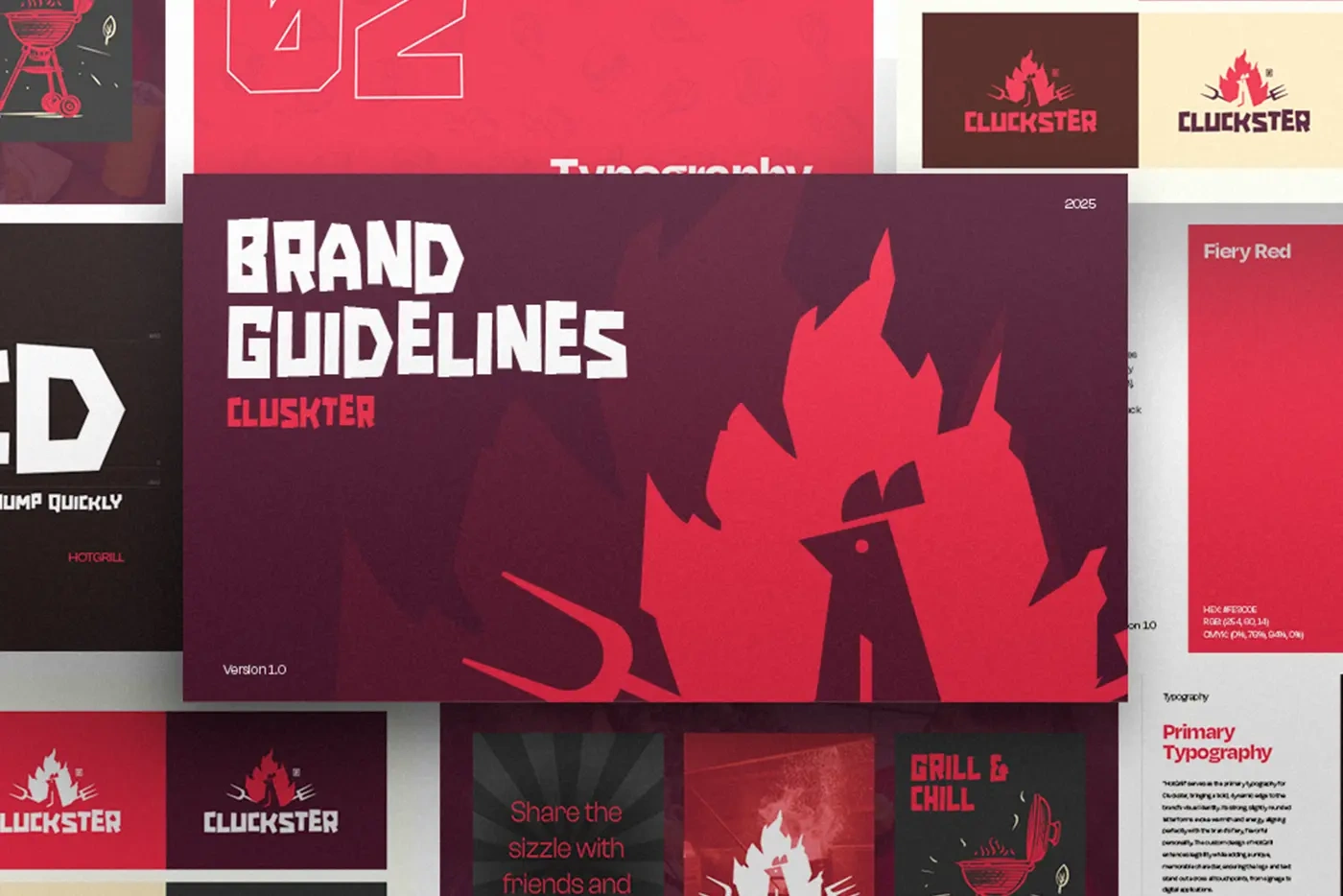 The guide goes beyond visuals covering logo spacing, packaging, merchandise, social media, and photography style to ensure every touchpoint feels cohesive, memorable, and unmistakably Cluckster.