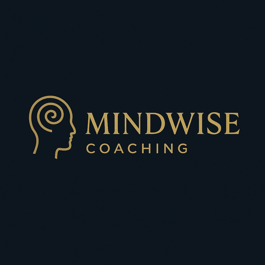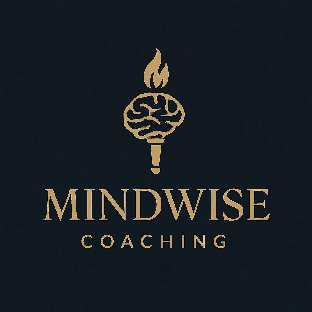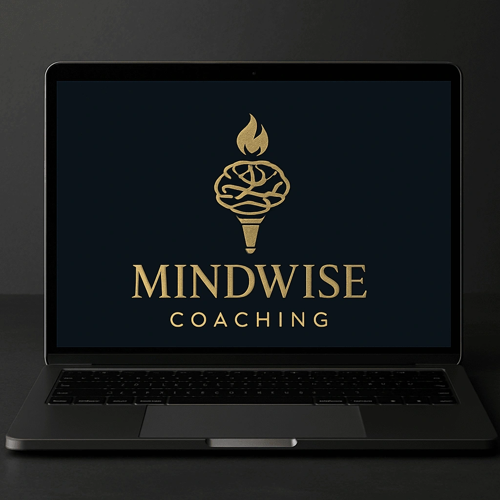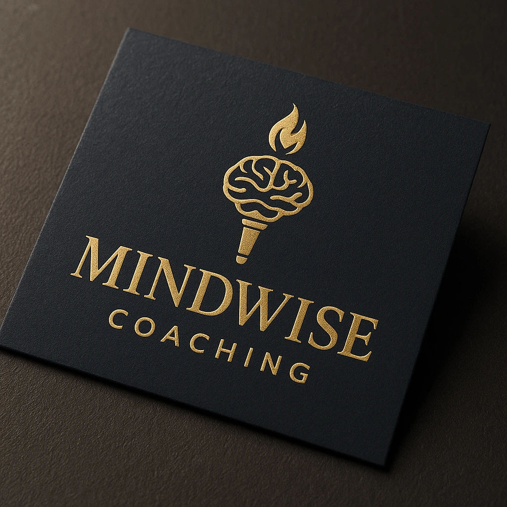 Sophisticated gold-on-navy logo featuring a brain-as-torch icon and refined serif wordmark; radiates enlightenment and premium coaching expertise.