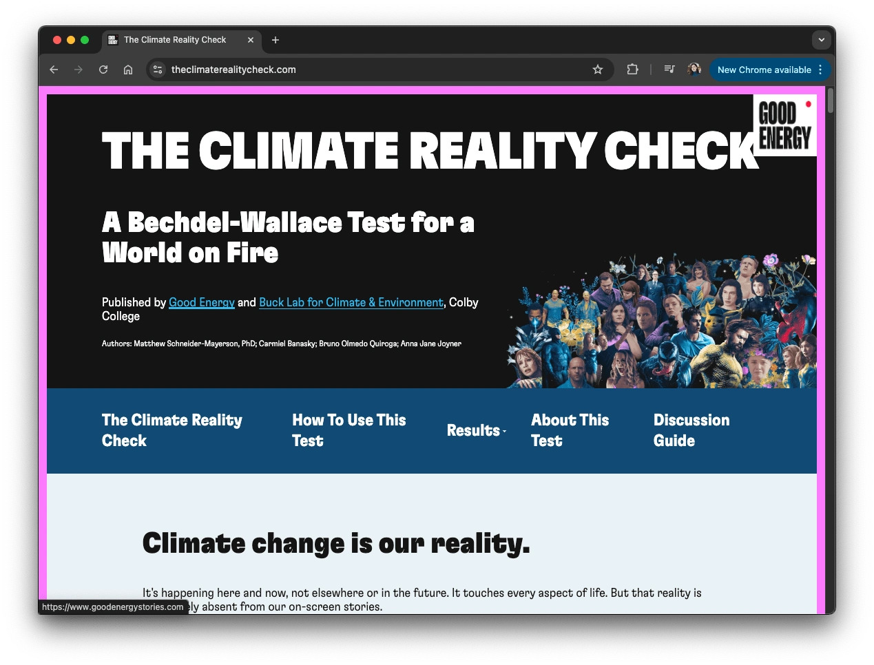 Good Energy Stories is a nonprofit that evaluates climate change in Hollywood. I managed web dev for their Climate Reality Check and maintain their technology.