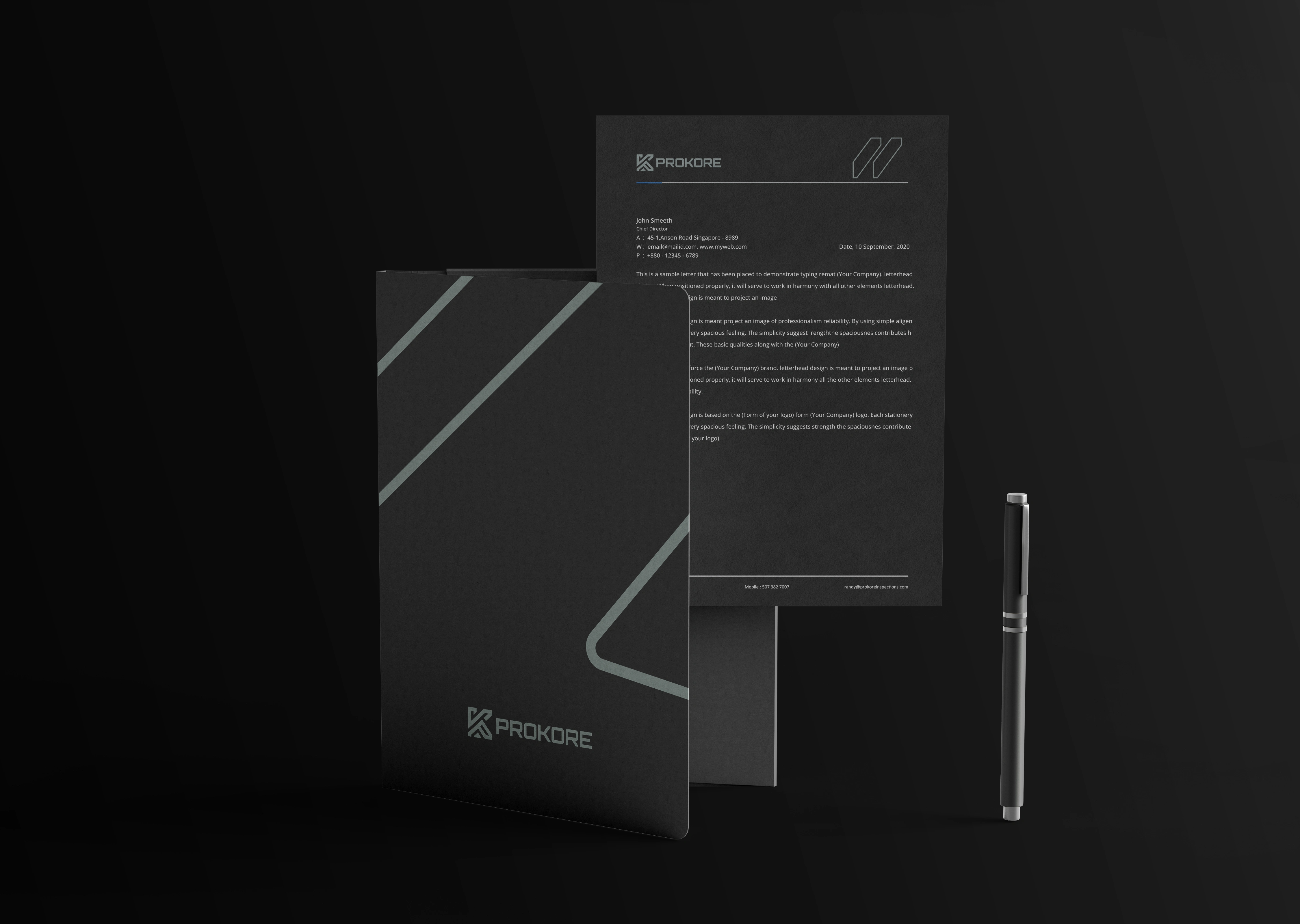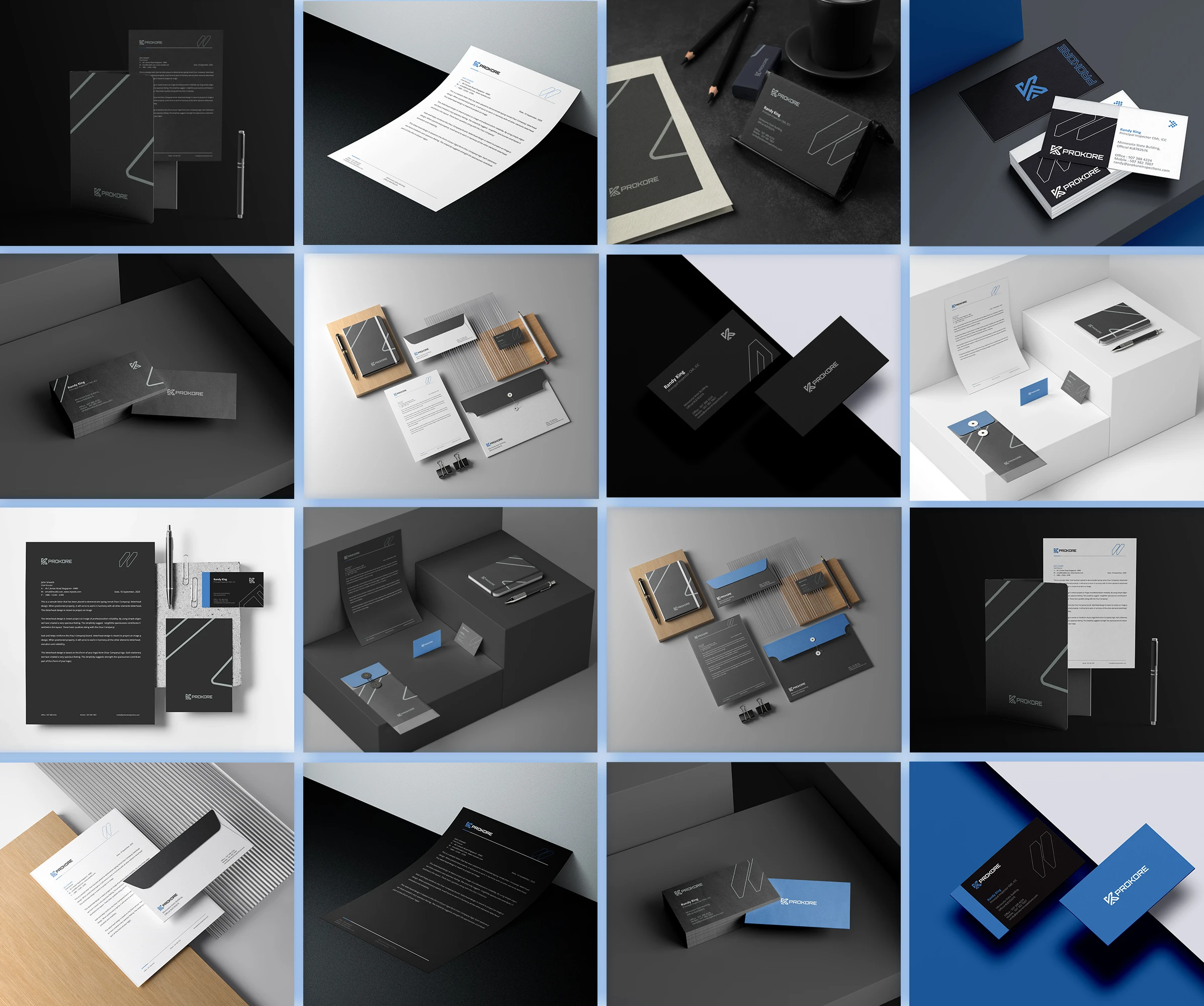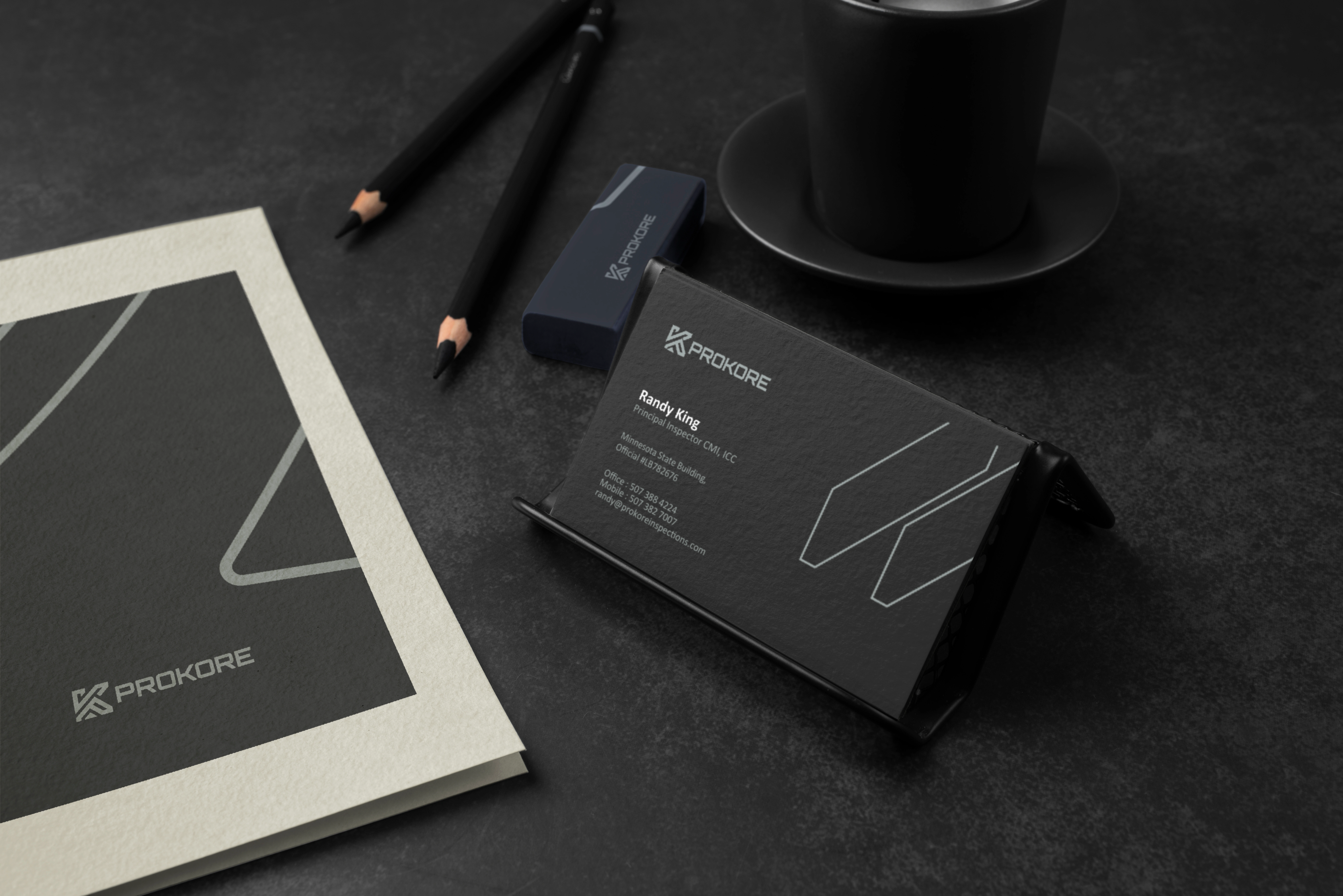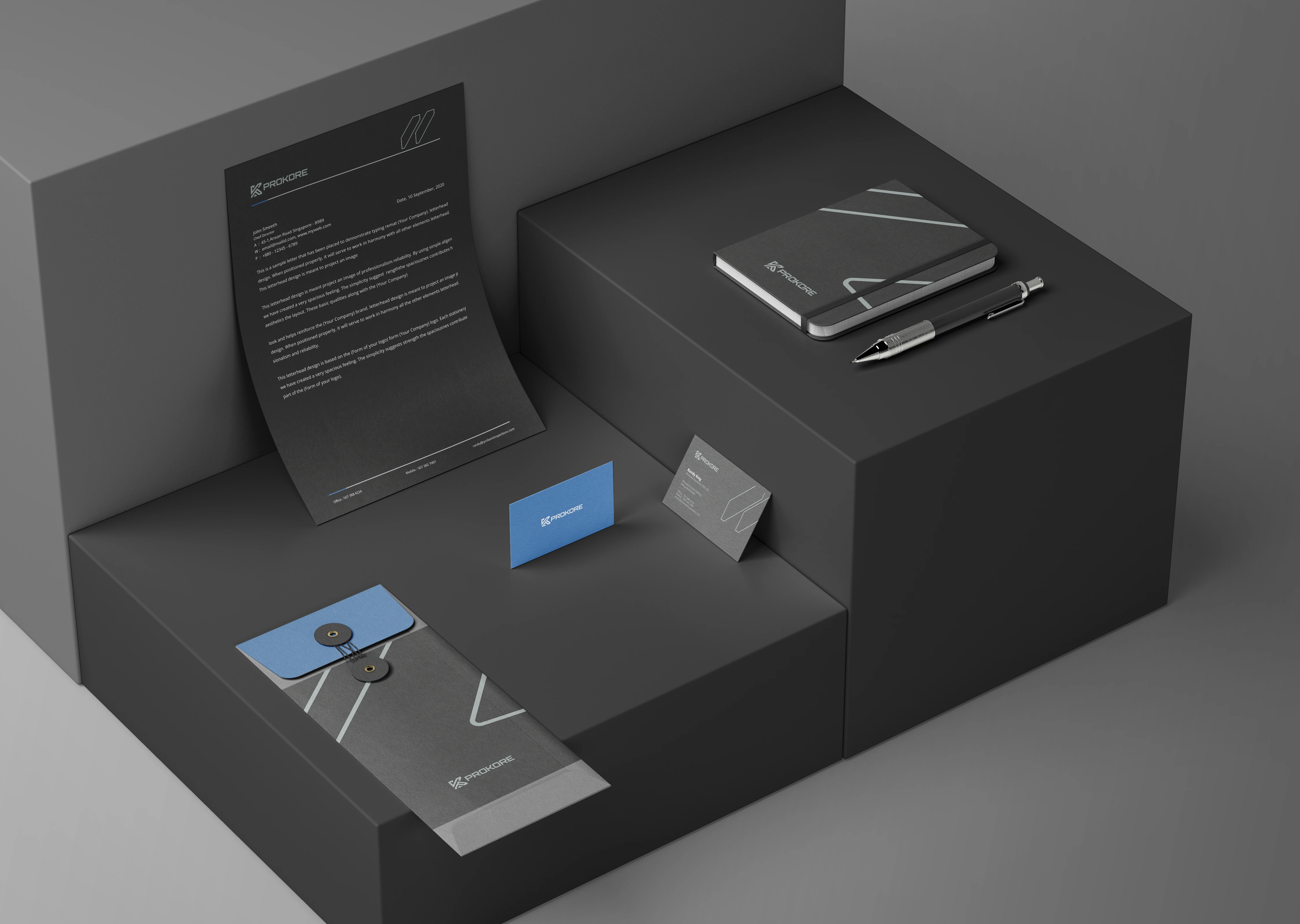 Designed a modern brand identity for PROKORE with a bold monogram, sleek blue-gray palette, and versatile applications across corporate platforms.