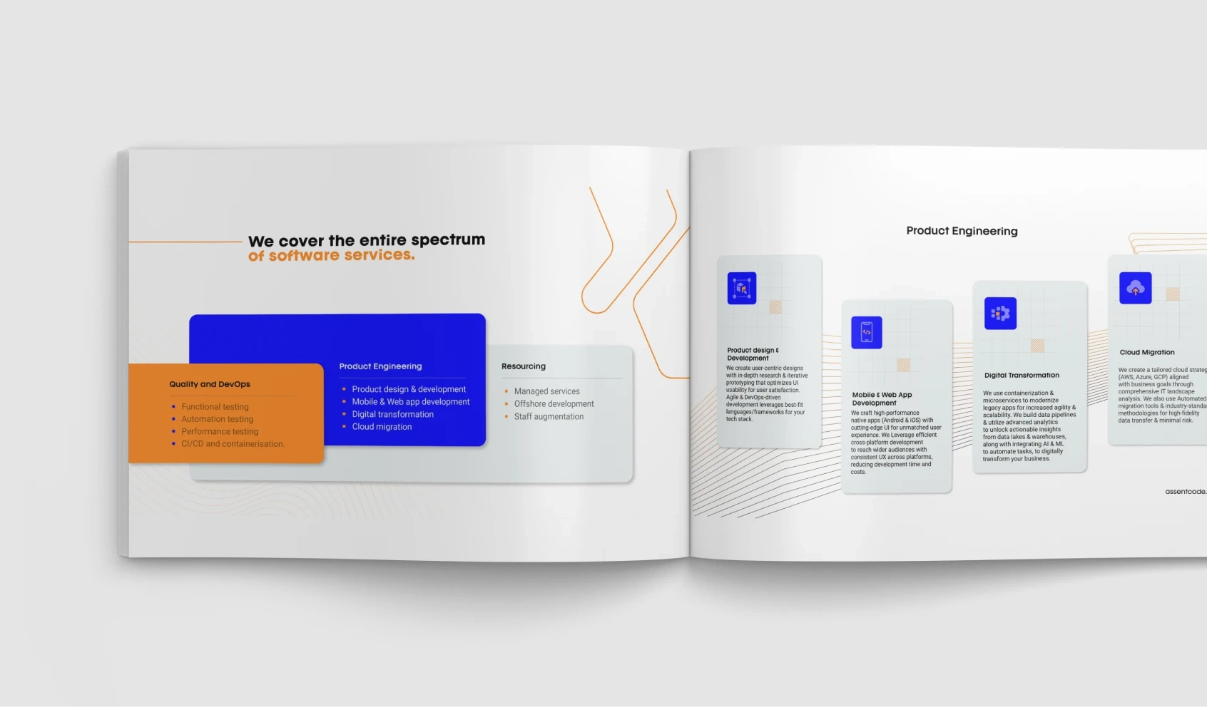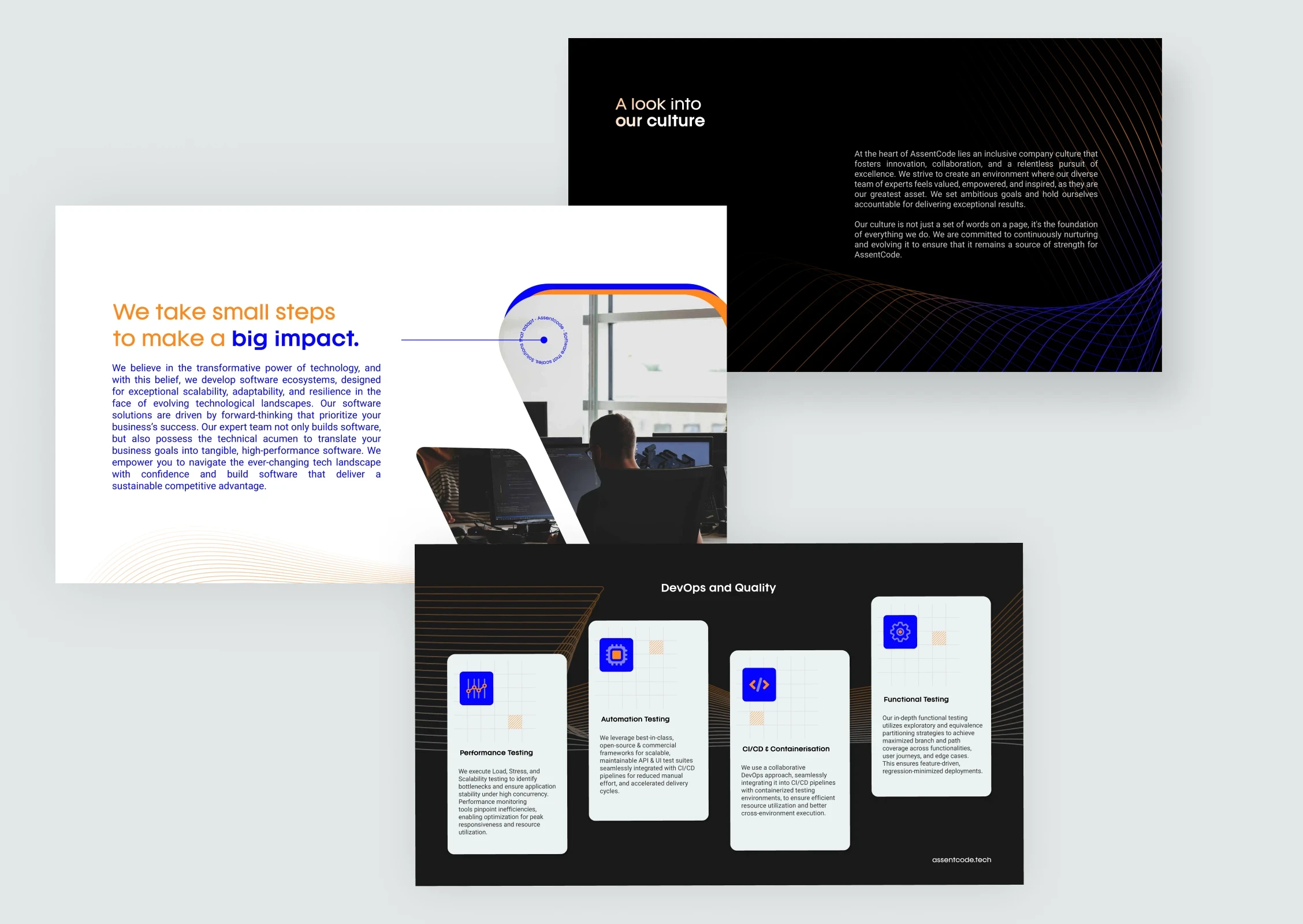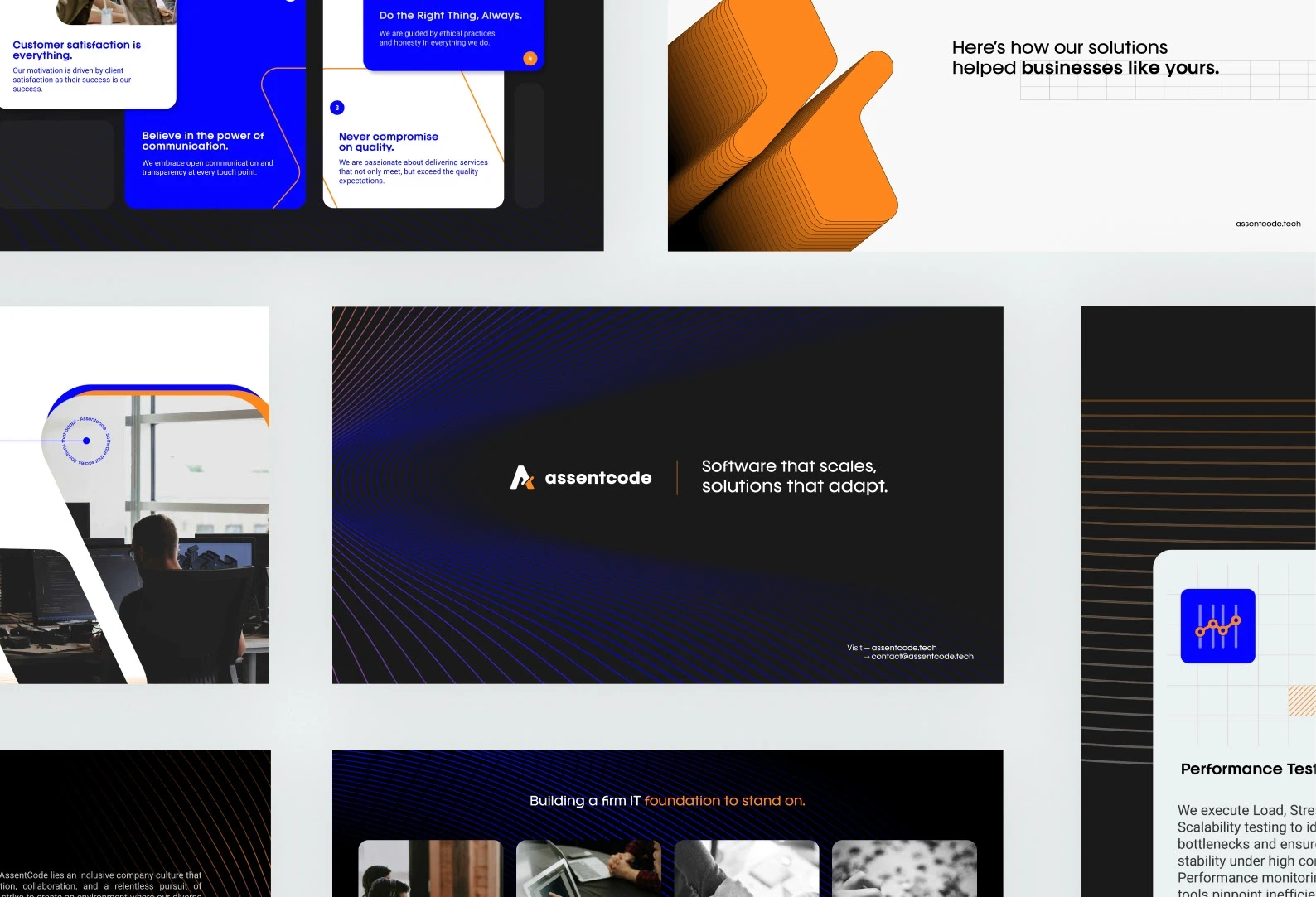 corporate presentation that effectively communicated their services, capabilities, and unique value proposition. The goal was to position AssentCode as a new-age, reliable and innovative technology partner, ensuring the deck appealed to potential collaborators and decision-makers.