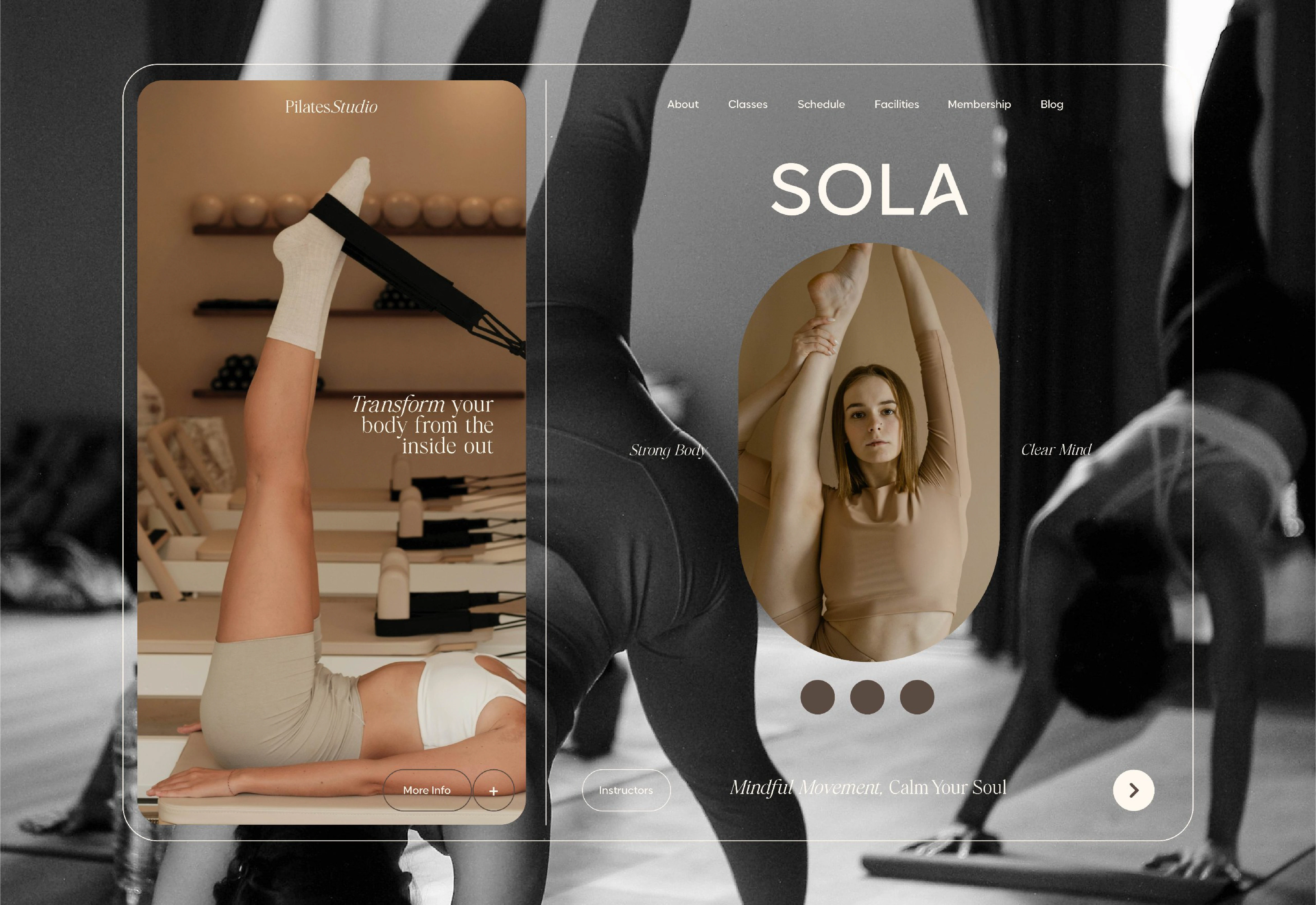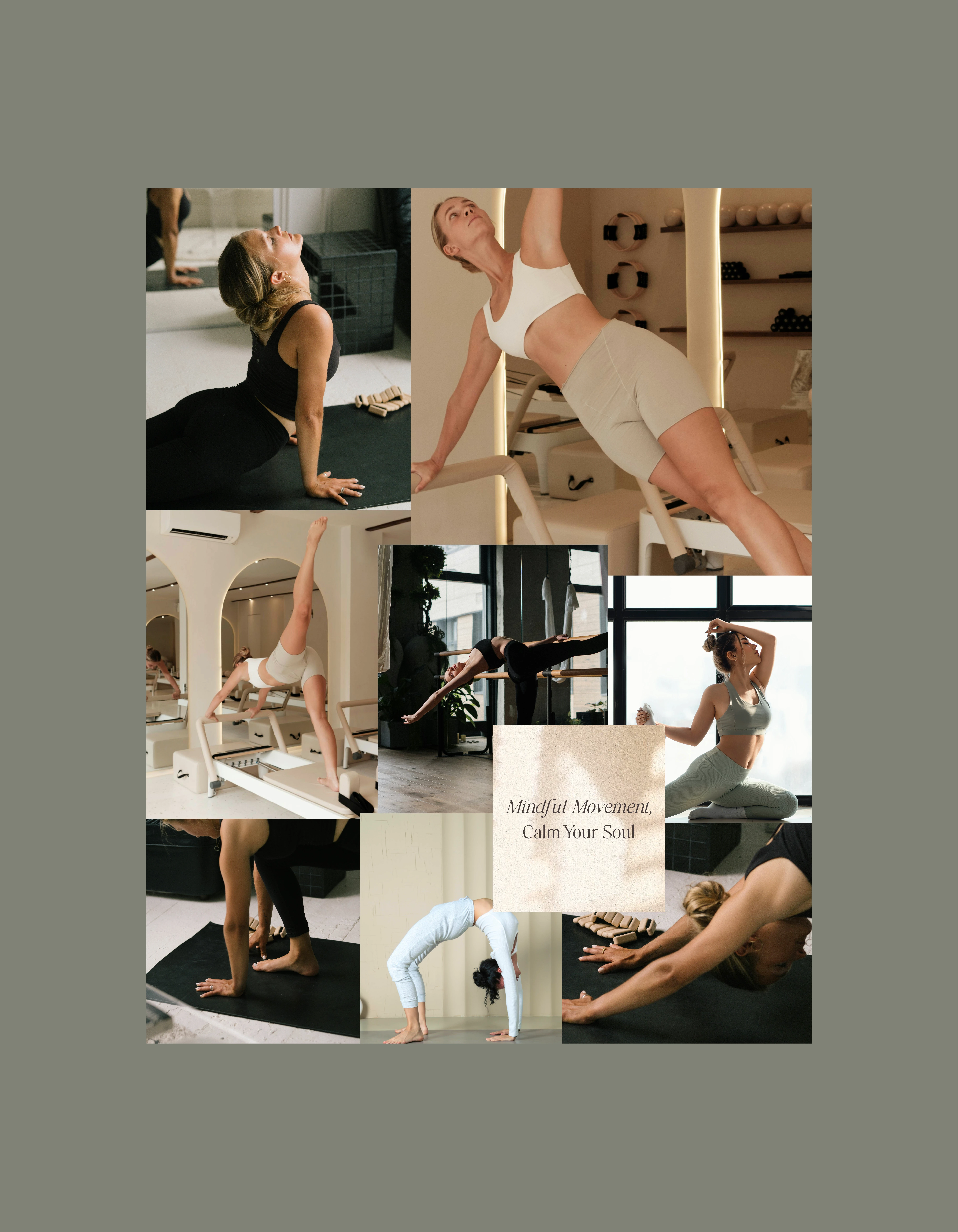 Our team approached this project by exploring the core principles of Pilates balance, control, and flow and translating them into visual elements. Through collaborative discussions, sketches, and iterations, we crafted an identity that feels fresh, empowering, and adaptable across both digital and physical applications. The result is not just a visual system, but a reflection of the studio’s mission: to inspire people to live with strength, clarity, and harmony.