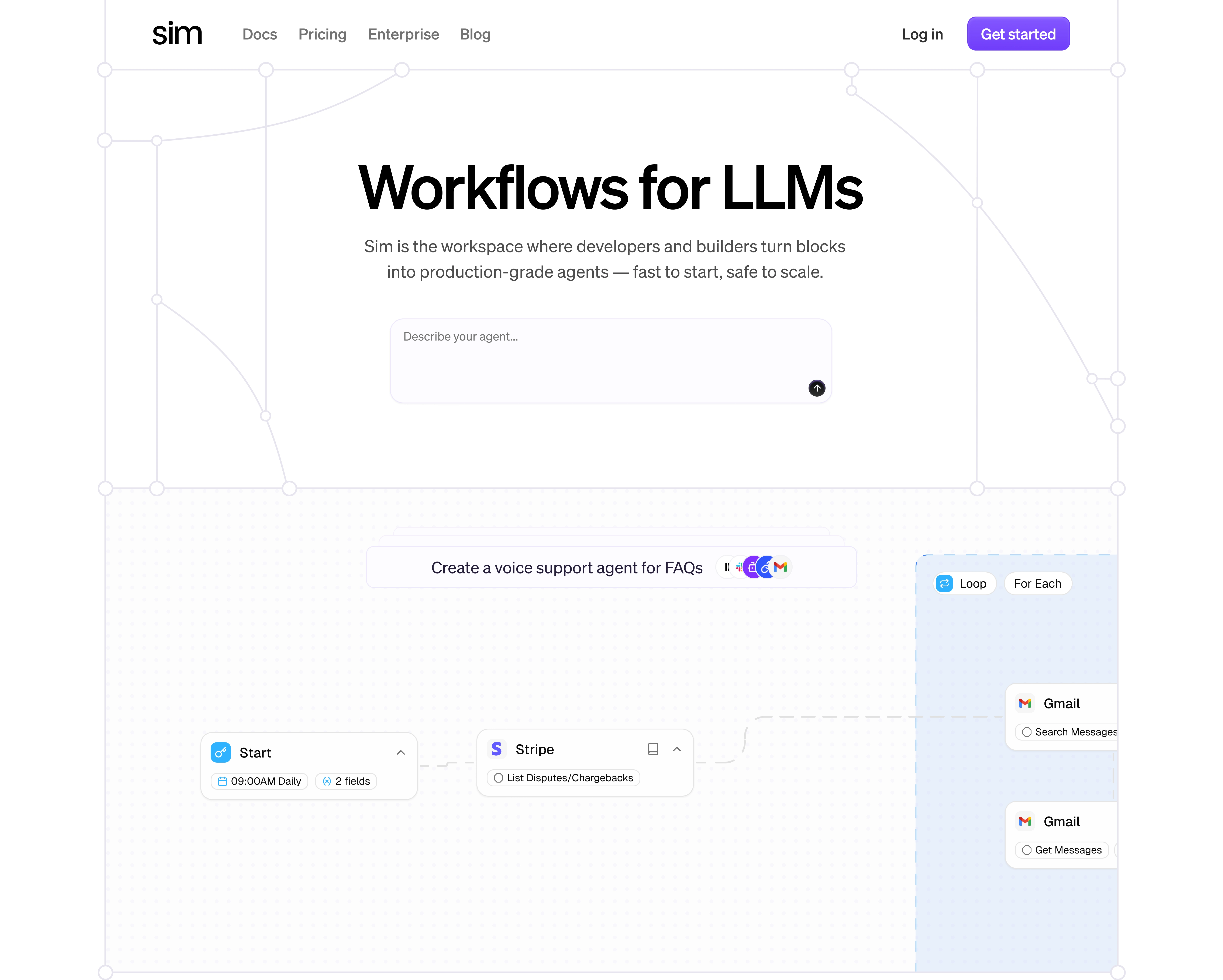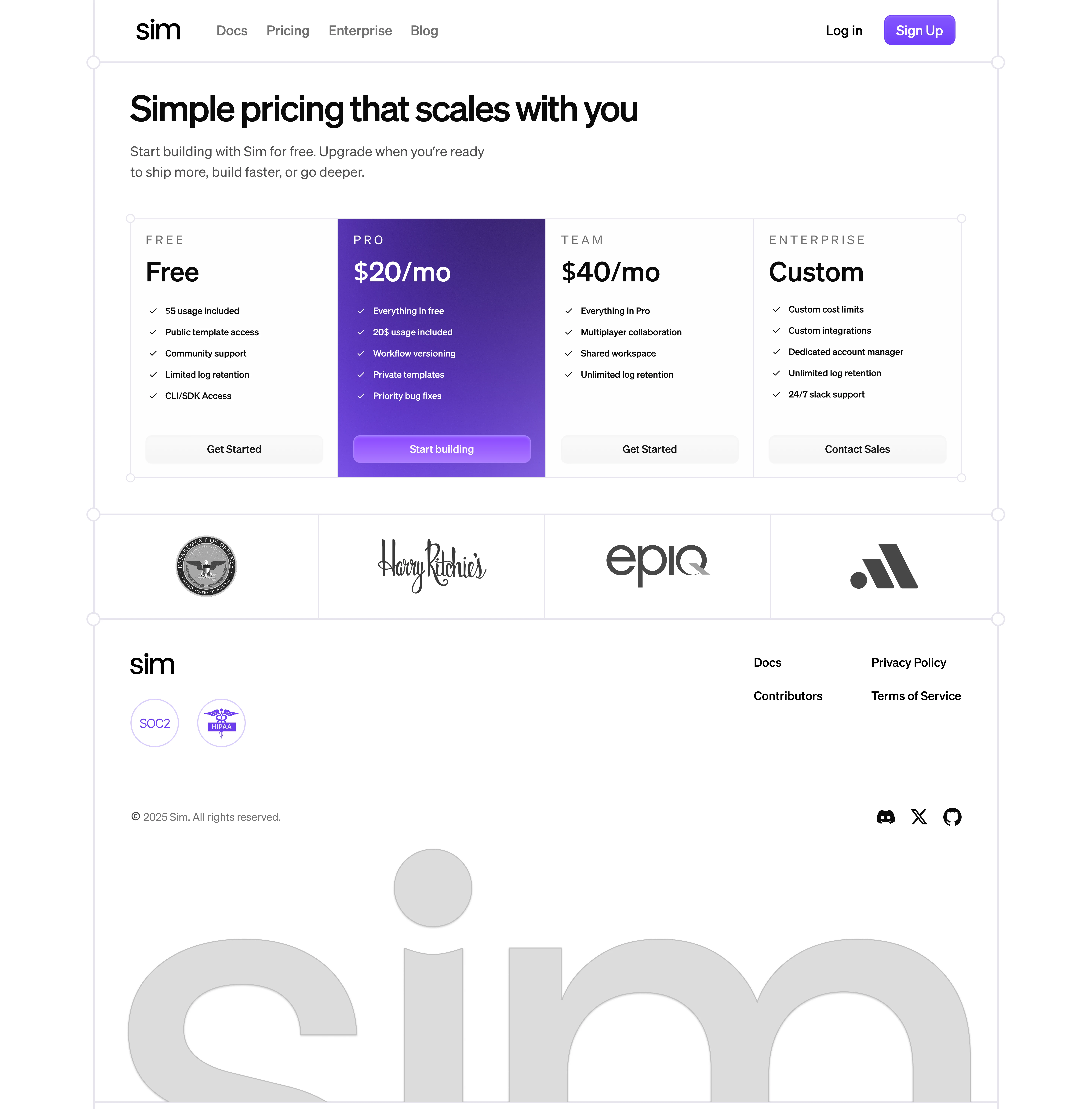 Sim is an AI workflow platform that connects humans and agents in a collaborative canvas. I partnered with the founders from day one to establish the brand, design the website, and build the product experience that positioned Sim as an user-centric company.