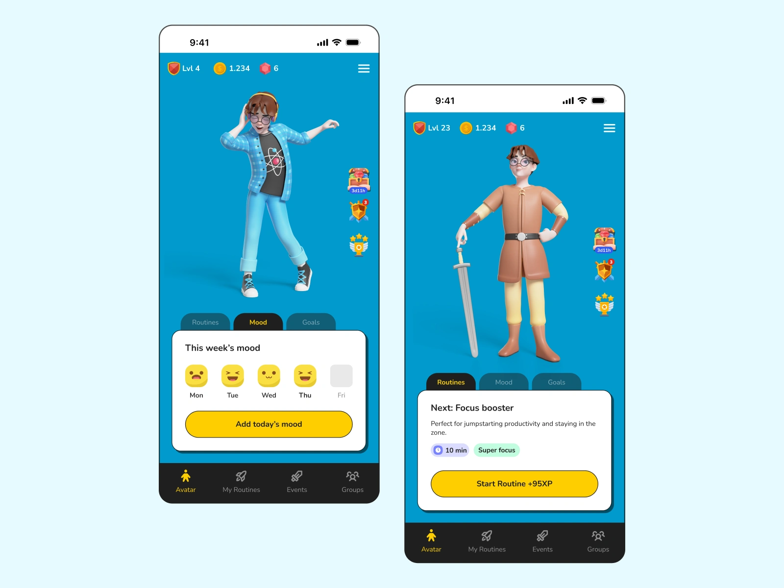 UI design for a fun and engaging routine and task management app designed to help kids and teens build healthy habits through gamification.