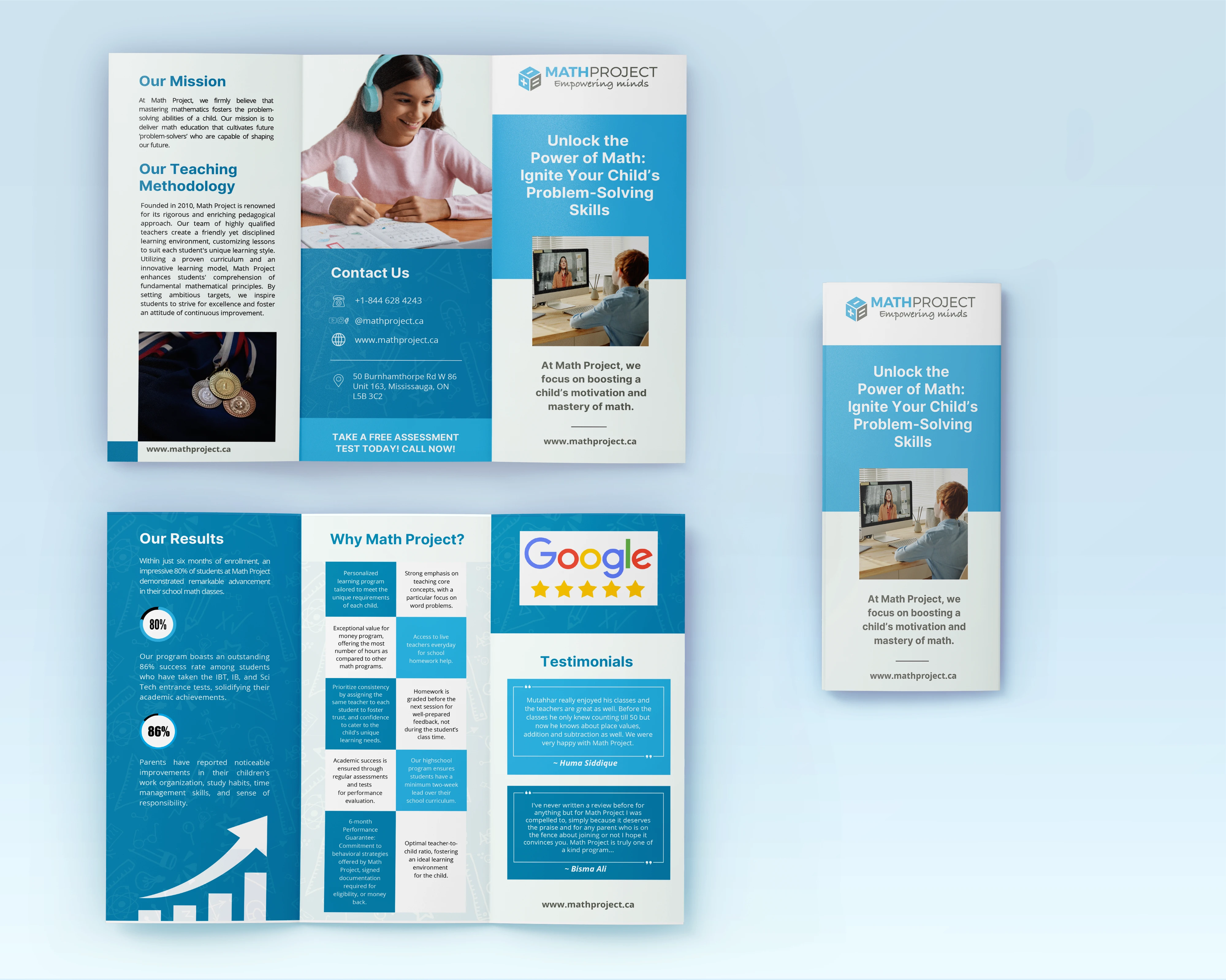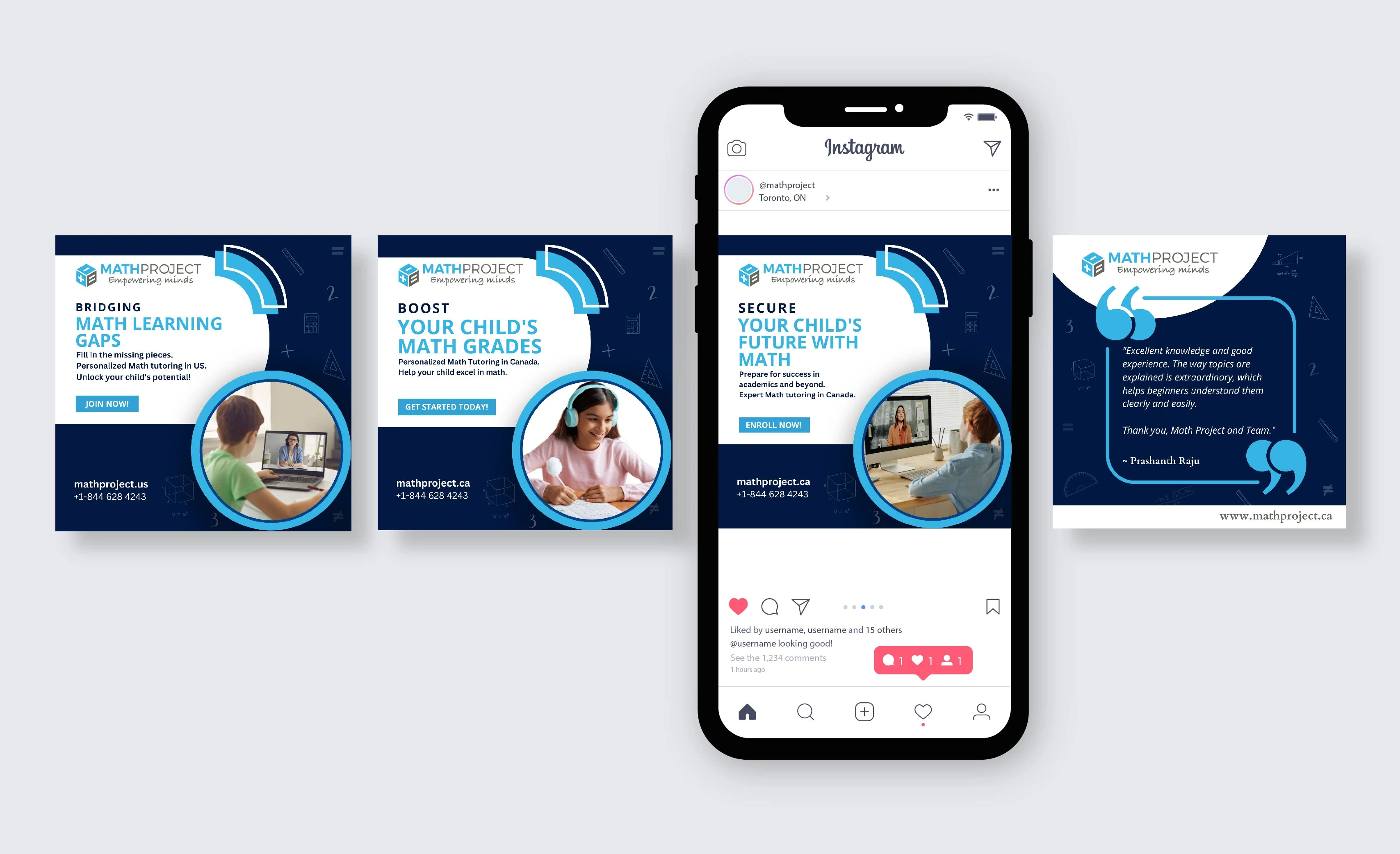 I designed a series of Math Project posts includes a mix of differentiator and testimonials content. The aim is to captivate the viewer's interest and inspire parents to enroll their children. The design seamlessly integrates Math Project's branding guidelines, characterized by a palette of harmonious blue shades. The addition of understated graphical elements, subtly conveying the essence of mathematics, contributes to the overall visual allure. The consistent application of these blue tones aligns perfectly with Math Projects’ established branding, culminating in a coherent and polished appearance. Moreover, the strategic incorporation of uncomplicated graphical elements, including icons and images, serves to enhance readability by interspersing the text and infusing the posts with an engaging visual quality.