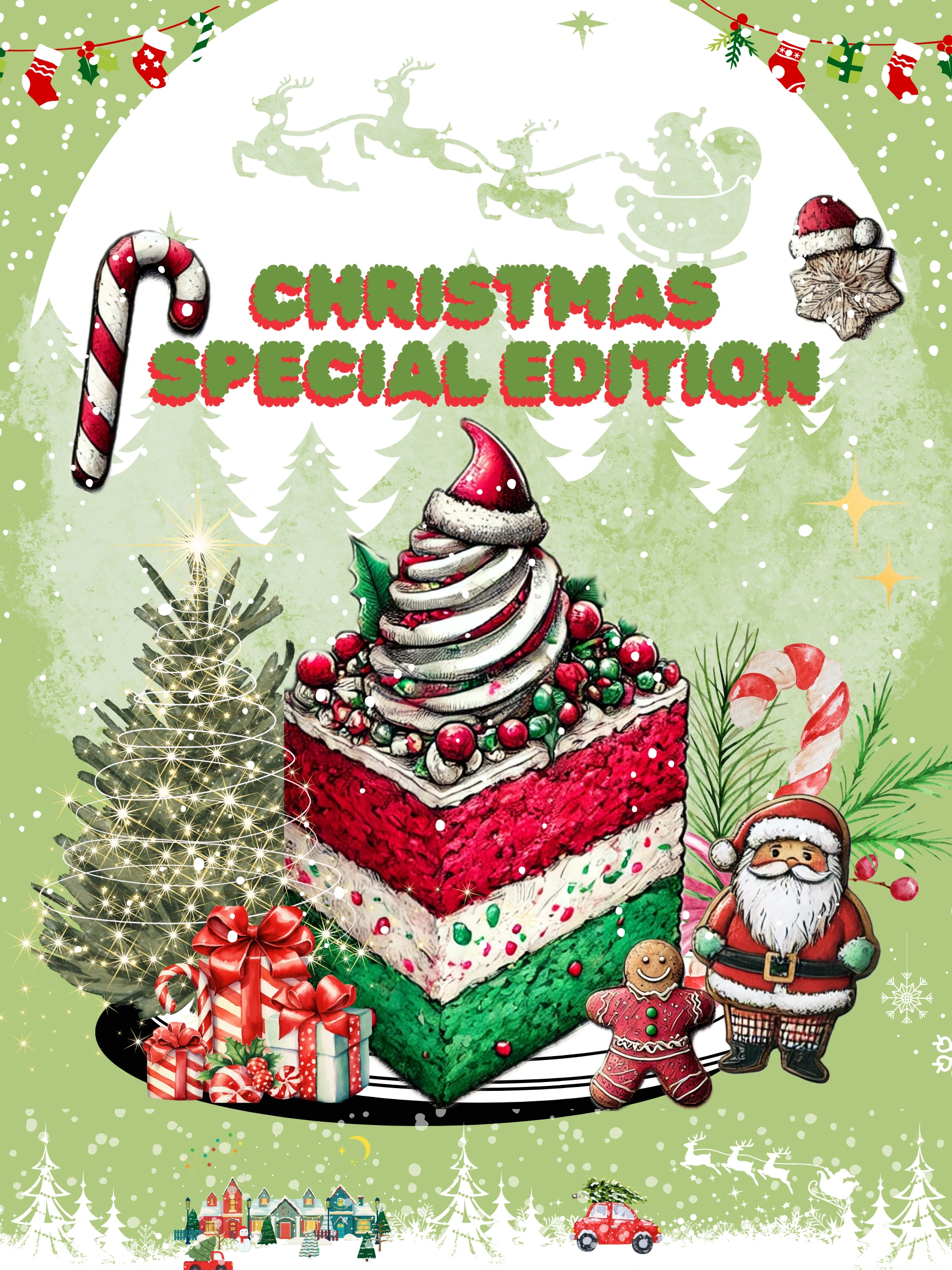 Holiday-themed dessert illustration created for a festive campaign. Includes detailed seasonal elements like Santa, tree, candy canes, and layered cake.