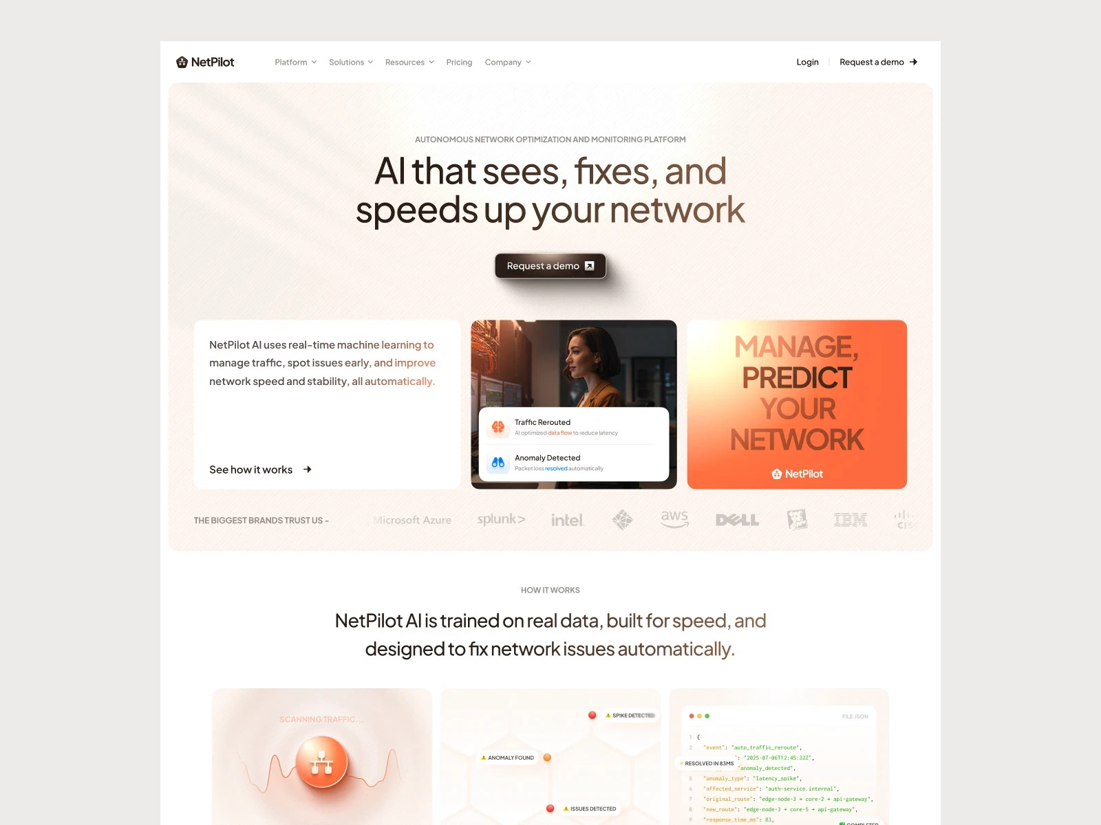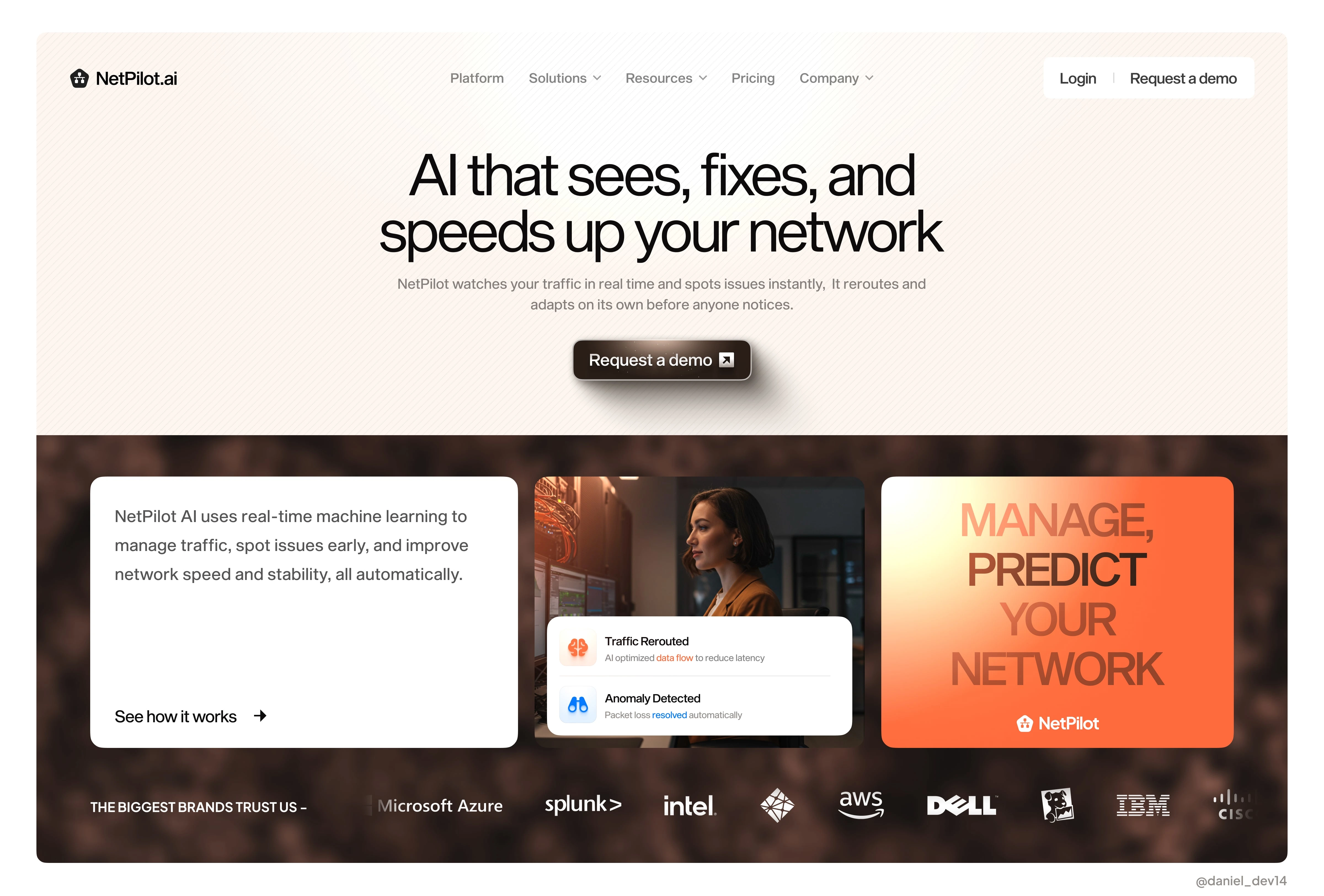 NetPilot AI is a simple landing page design showcasing the power of AI that monitors network traffic, detects issues in real life with offers to fix them.