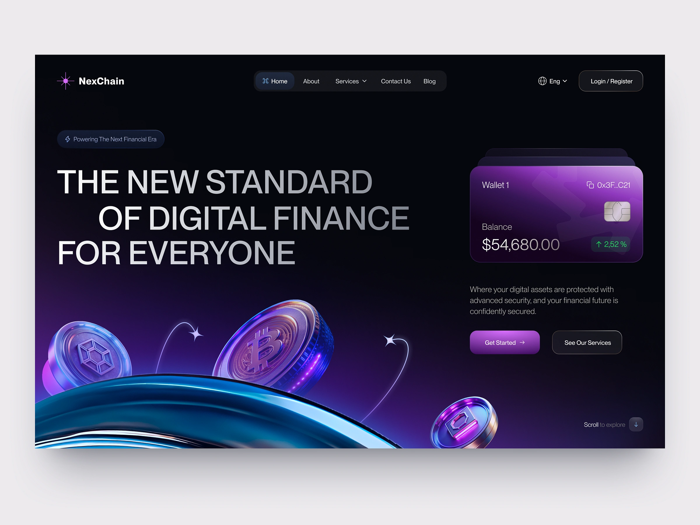 NexChain’s landing page is all about bold vibes and future finance. Bright gradients, 3D coins, and clean type come together to keep things fresh and user-friendly. With wallet previews, smart CTAs, and a layout that speaks crypto fluently, NexChain makes managing digital assets feel easy and exciting, all while keeping it secure and accessible for everyone.
