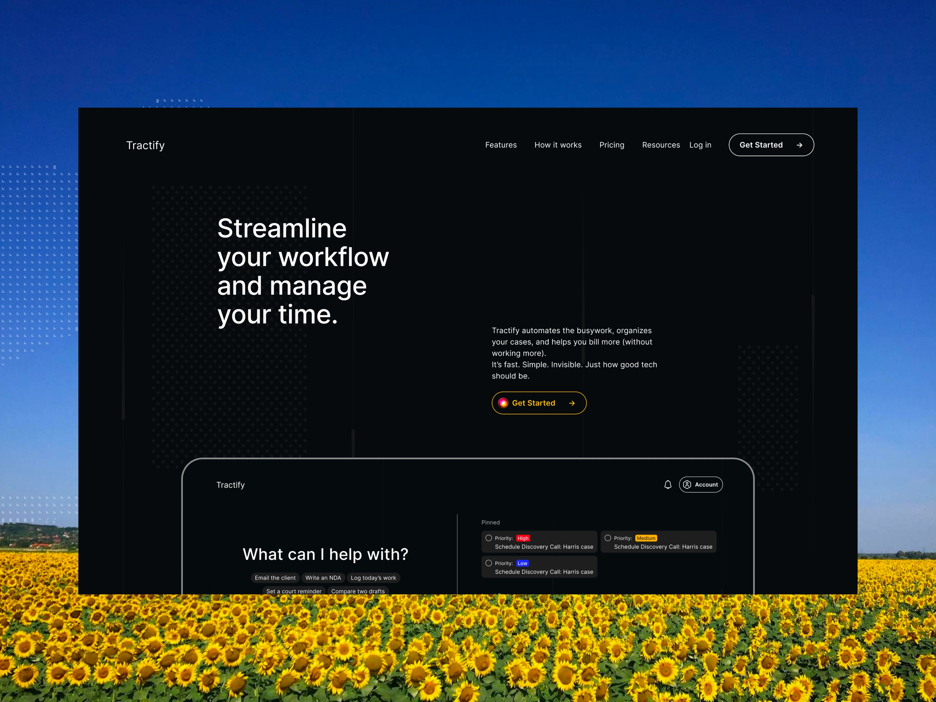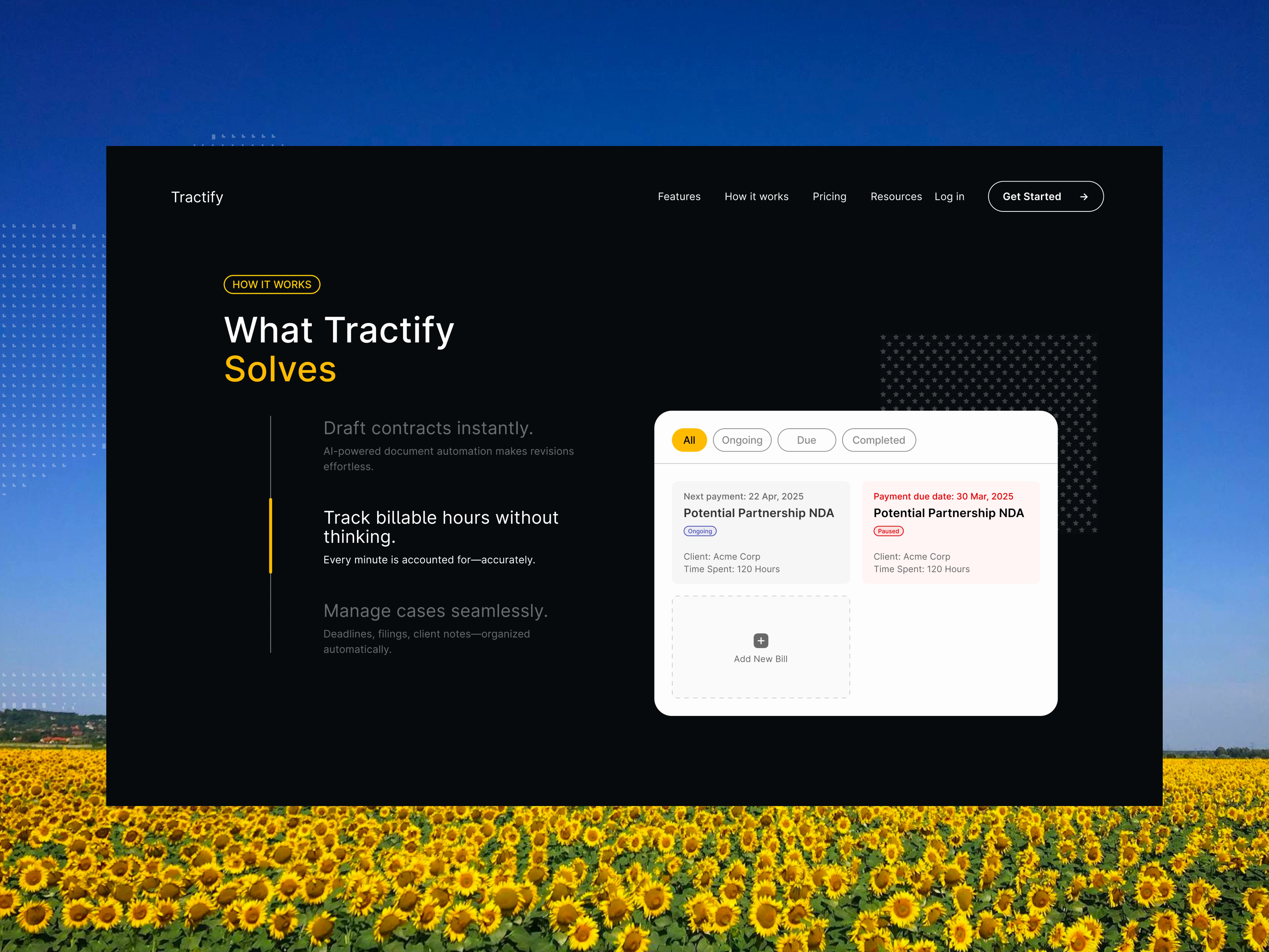 I structured the site with a clear navigation system for Features, Pricing, Resources, and Support, ensuring that each path quickly leads to product benefits and relevant calls-to-action. The hero section was redesigned to communicate Tractify’s value in under five seconds with concise copy and a bold visual mockup of the dashboard.