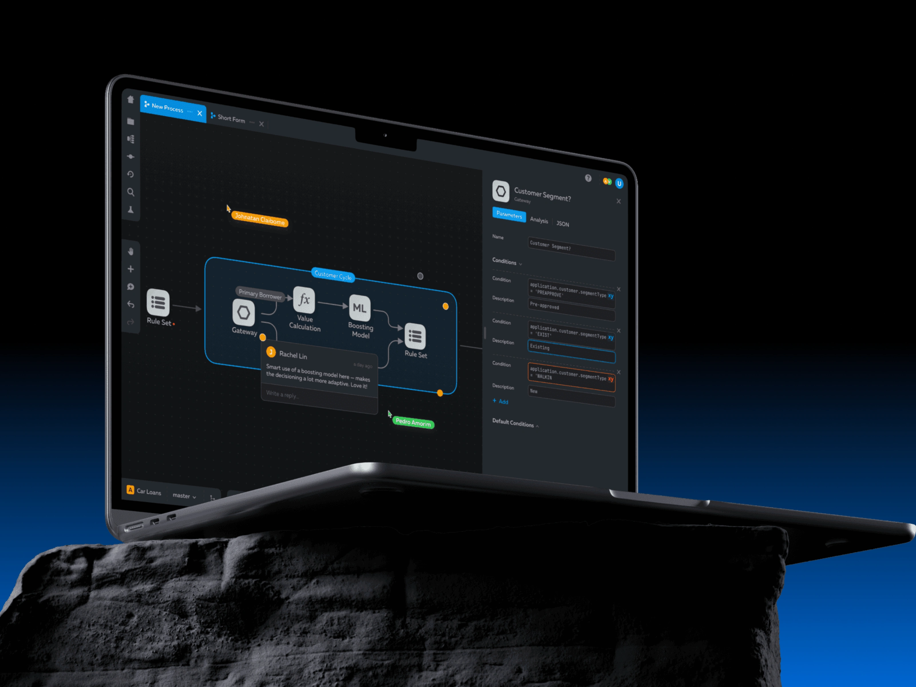 A powerful environment for analysts, risk officers, and ops to build and refine decision logic — fast and without friction.